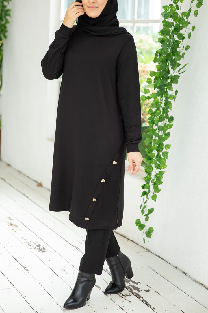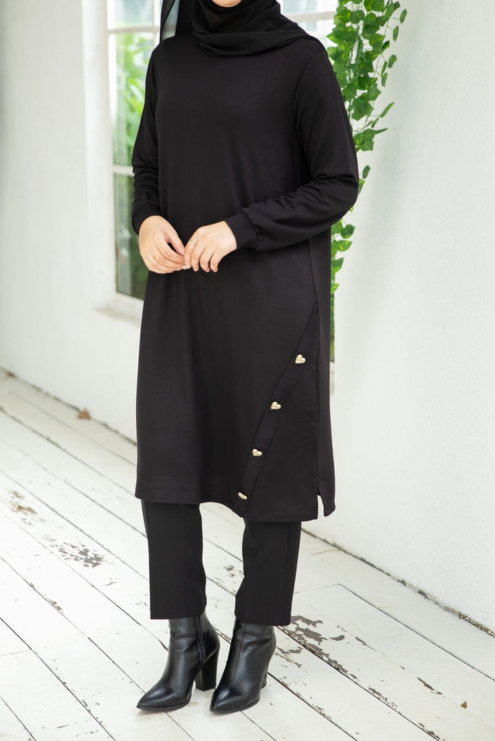 قصة مستقيمة منسدلة تمنحك مظهراً محتشماً ومتناسقاً، مزينة بأزرار جانبية على شكل قلوب تضيف لمسة أنثوية ناعمة 🤍