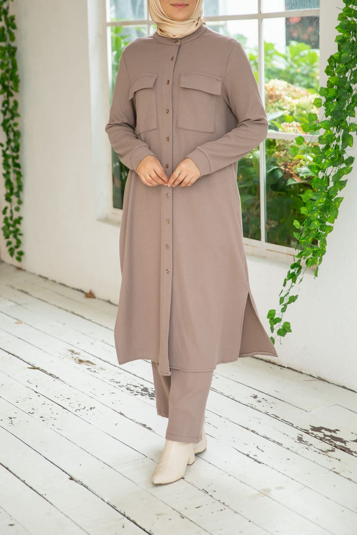 الطقم مكوّن من توب بأزرار أمامية كاملة بتفاصيل جيوب علوية تضيف لمسة عملية، مع بنطلون واسع مريح يمنح حرية حركة وأناقة هادئة.