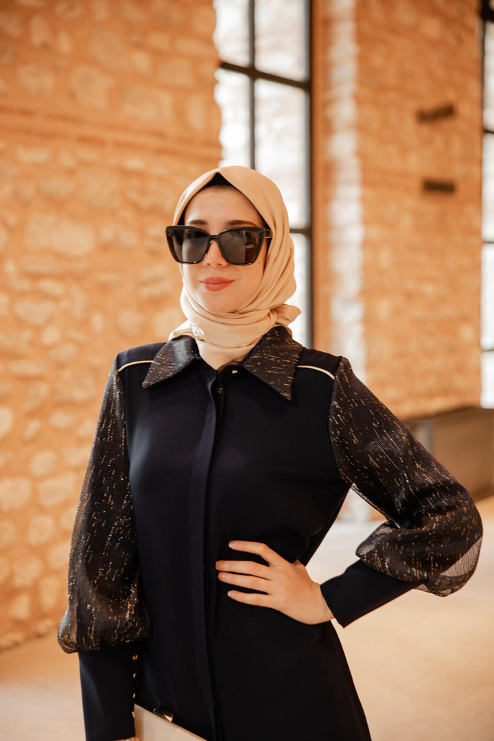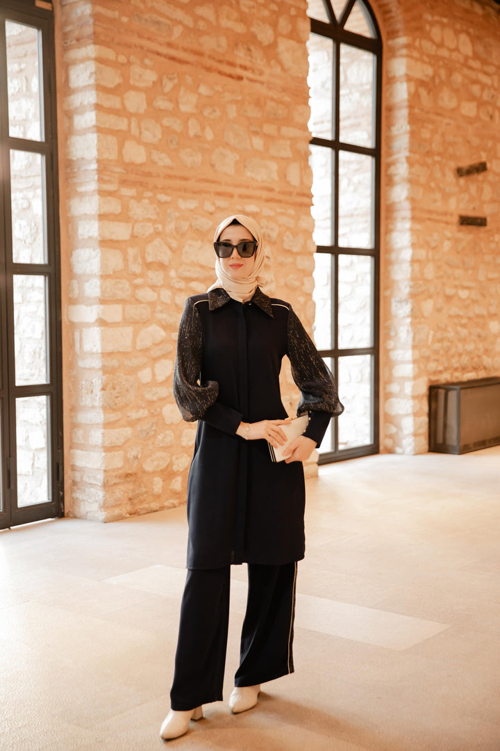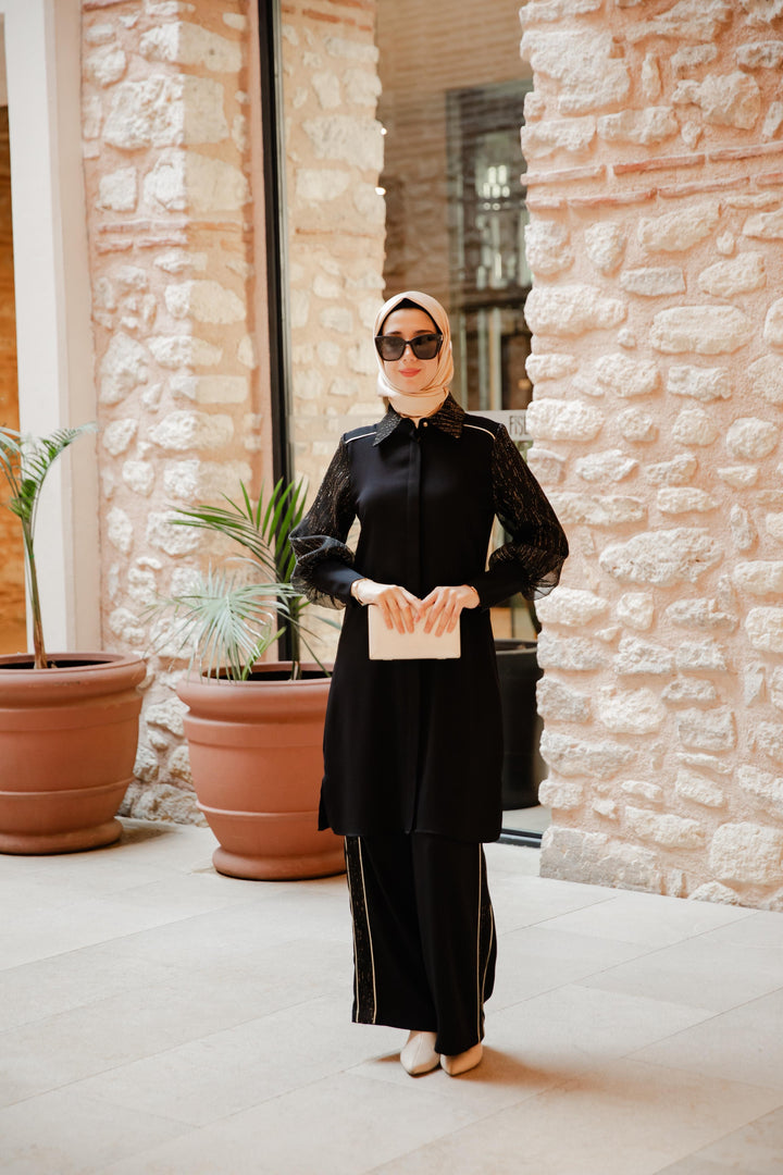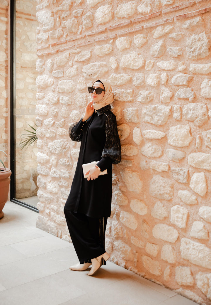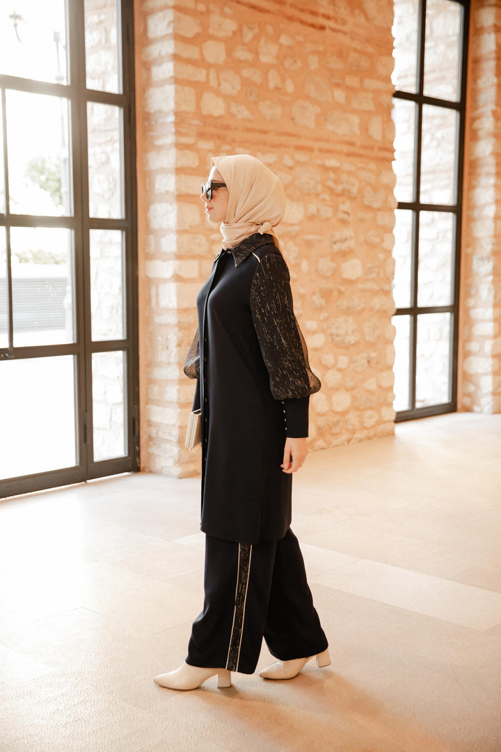 👚 القطعة العلوية: قميص طويل بقصة مستقيمة، بياقة كلاسيكية وأكمام منفوخة تضيف لمسة فخمة مع أزرار جانبية ذهبية.