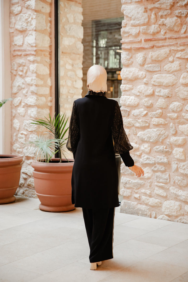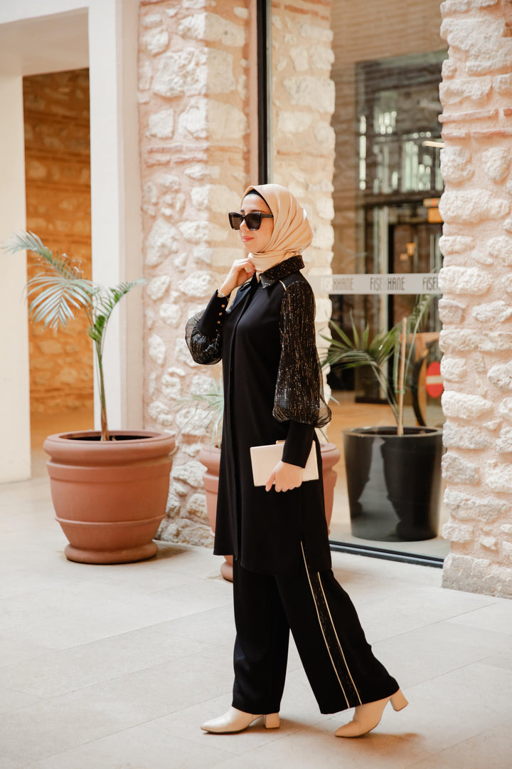 👖 البنطال: واسع ومريح بتفصيلة لامعة على الجوانب تعكس الضوء برقيّ.