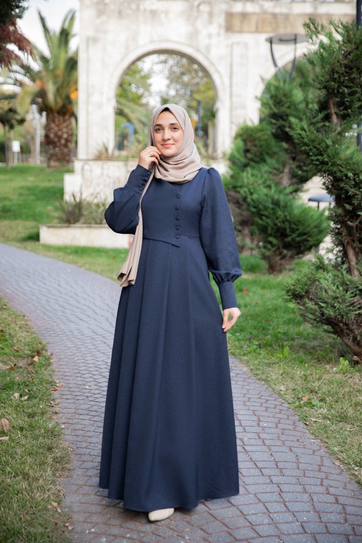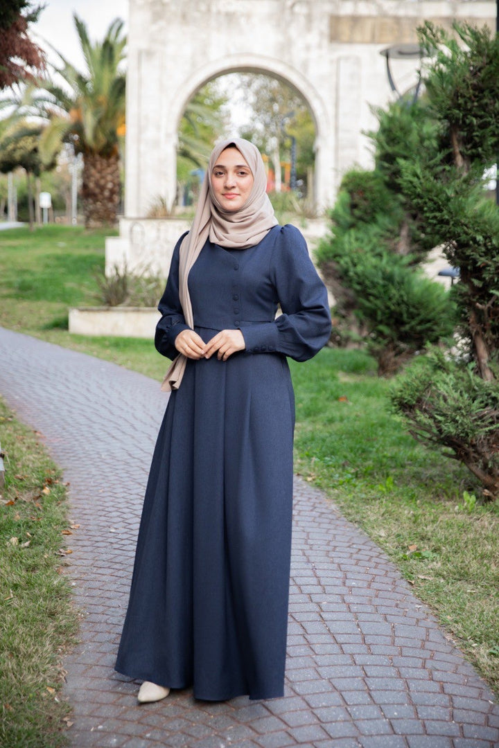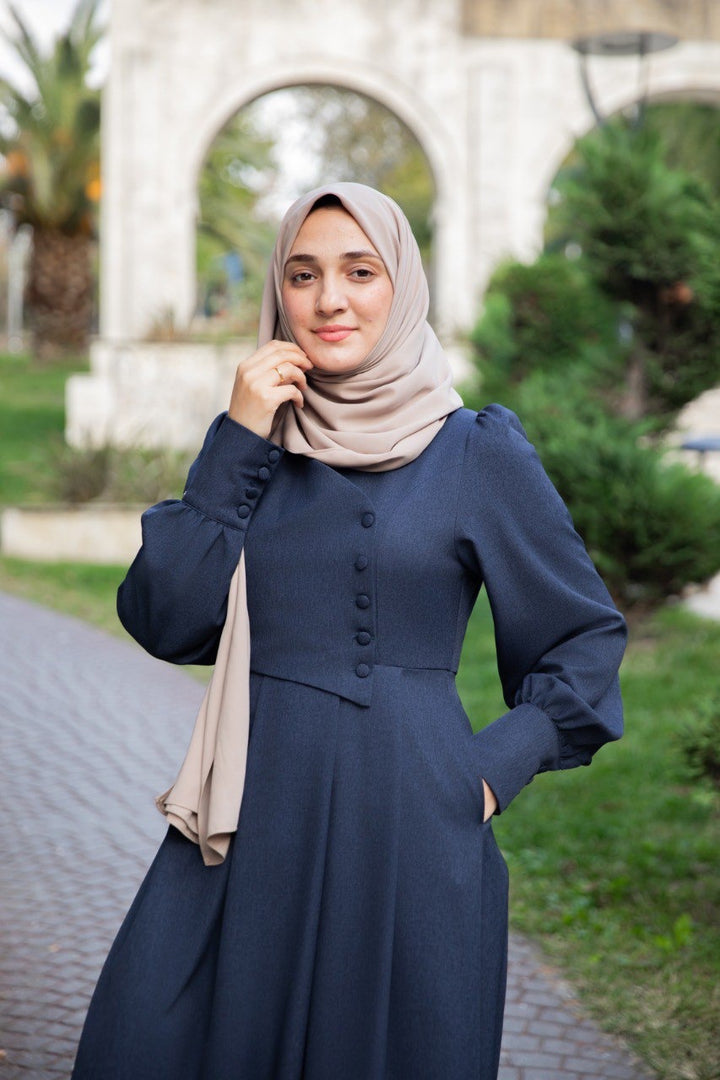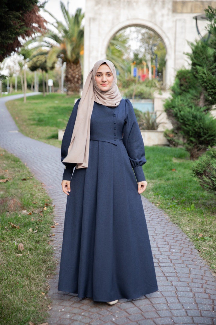 يتميّز بسحاب مخفي من الخلف لسهولة اللبس، وتصميم مائل مع أزرار مغطاة من نفس القماش يبرز جمال القصة بانسيابية وأناقة.