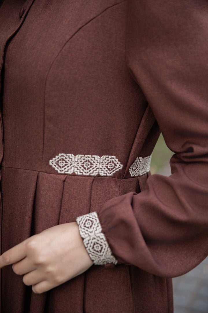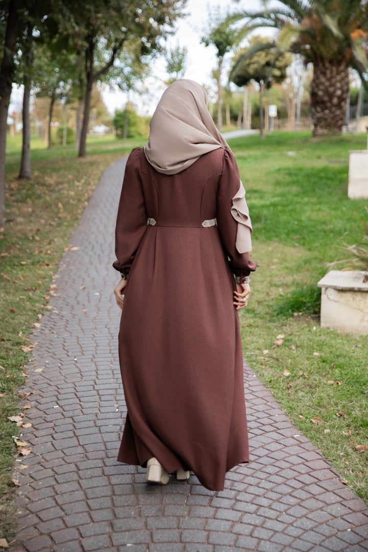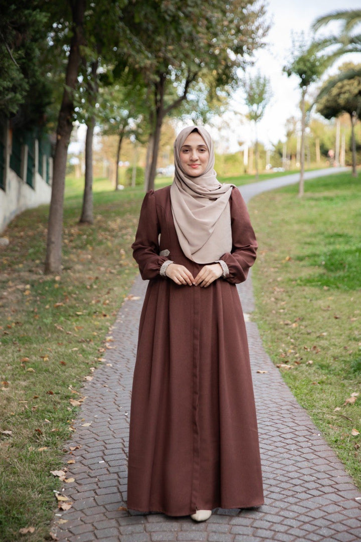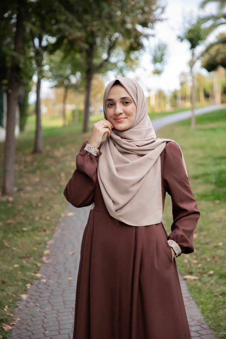 تصميم مستقيم من الأعلى مع خصر مطرز برقة، وينسدل بانسيابية ناعمة حتى الطول الشرعي.