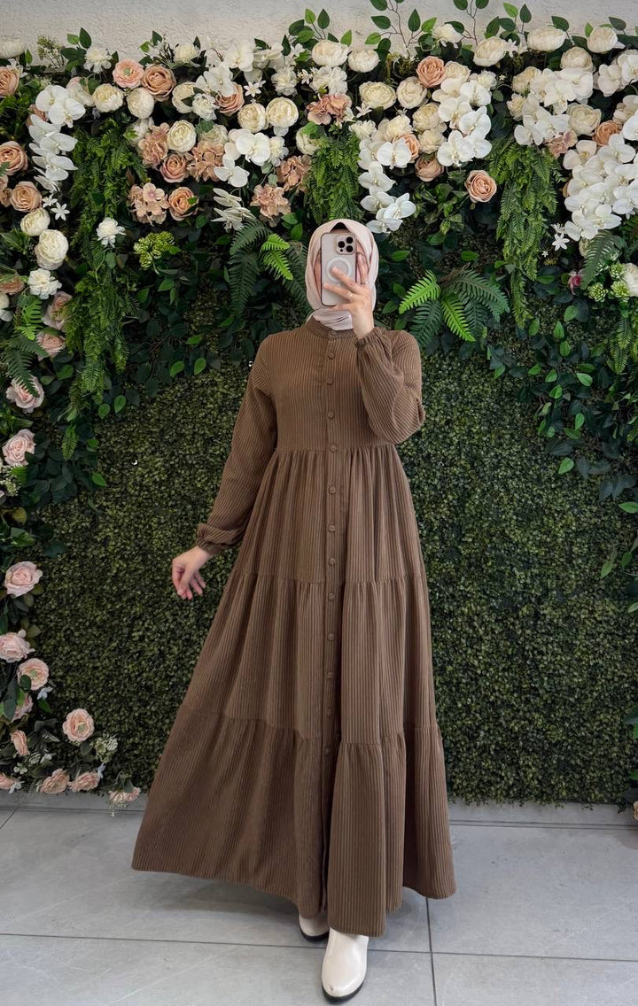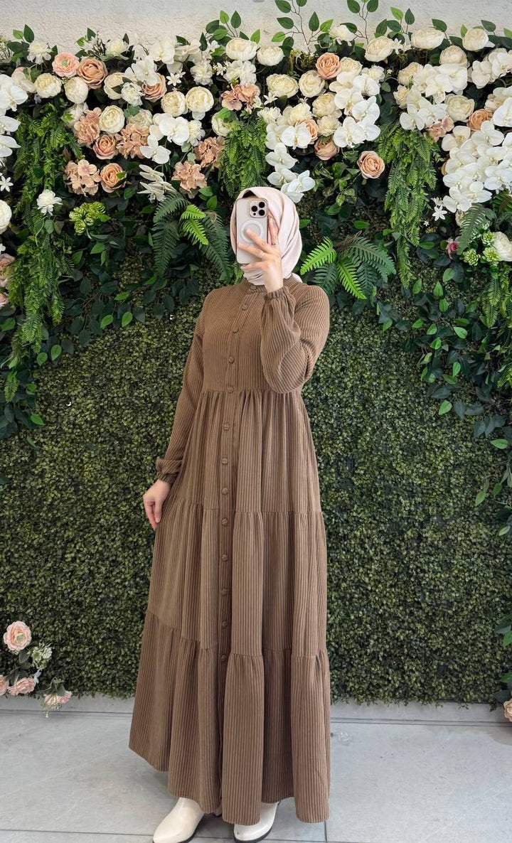 قَصّته واسعة بانسيابية مريحة من الأعلى للأسفل، مع طبقات خفيفة تضيف حركة أنيقة للفستان.