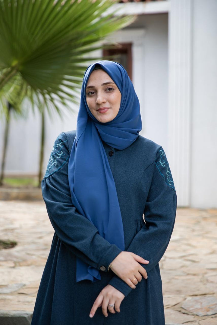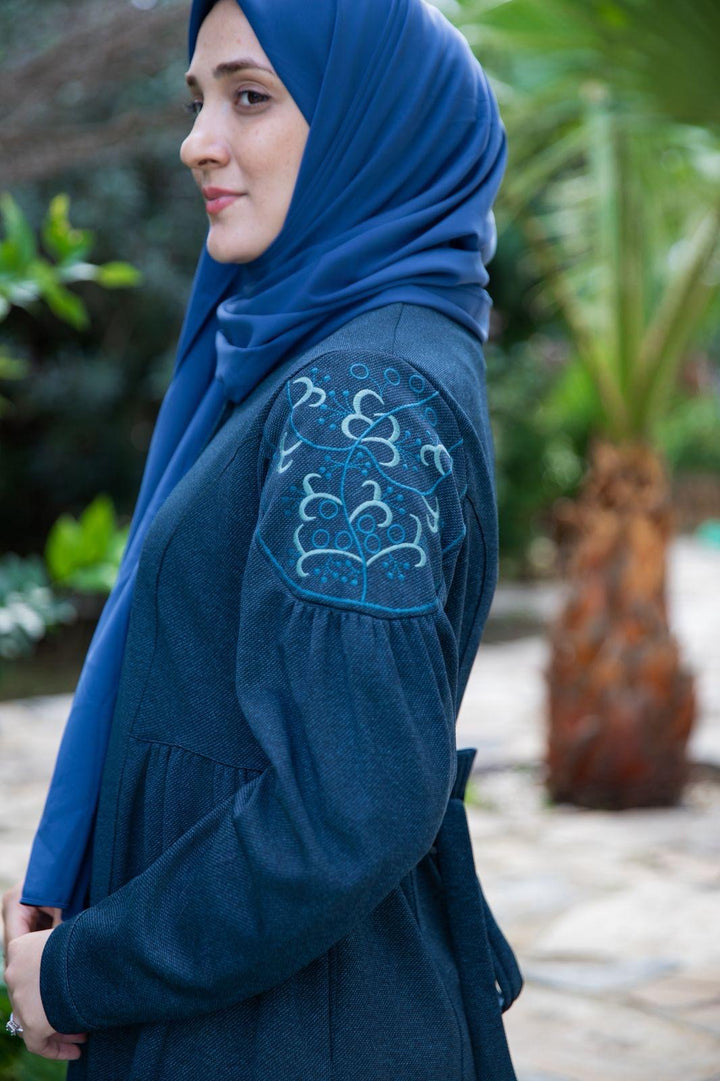 الأكمام منفوخة بنعومة مع تطريز فاخر على الكتف يبرز جمال القماش والقصّة.
