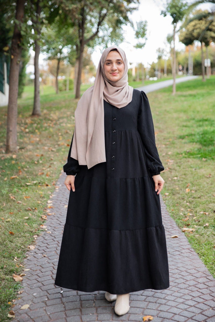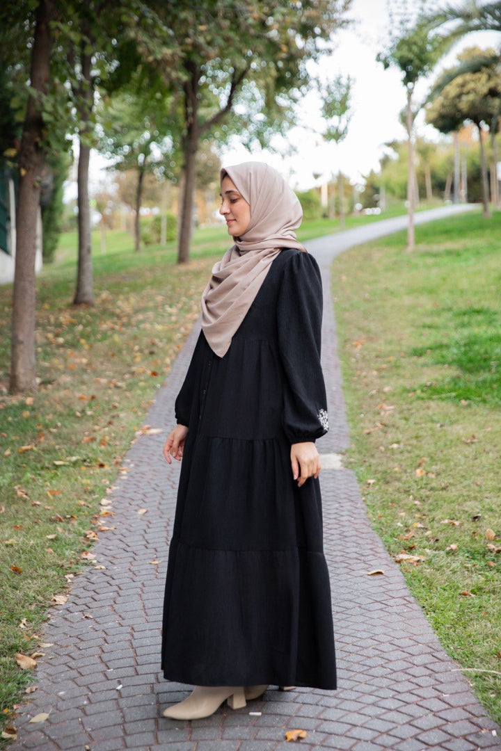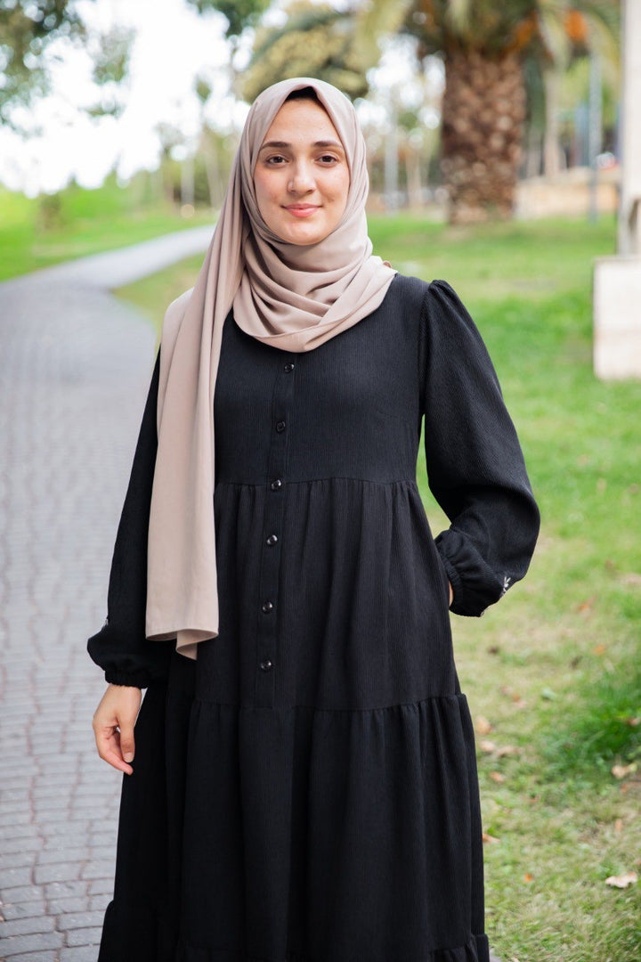 قَصّته واسعة بانسيابية مريحة من أعلى إلى أسفل، مقسّمة بطبقات ناعمة تمنح حركة أنيقة مع كل خطوة.