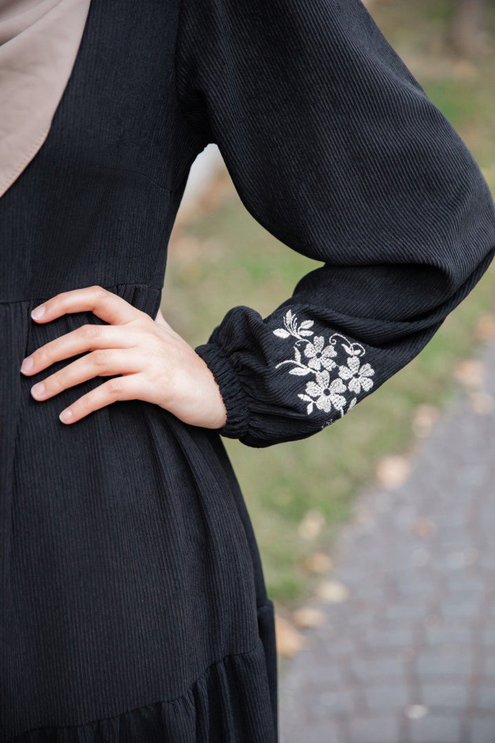 الأكمام منفوخة بخفة وتنتهي بتطريز زهري أنثوي على الكُمّين يضيف لمسة فنية راقية 🌸