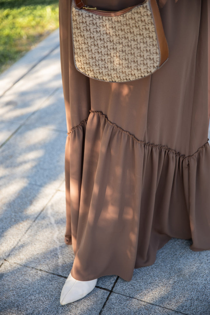 قصة واسعة بانسيابية ناعمة، مع كشكش سفلي أنثوي يضفي حركة راقية للفستان.
