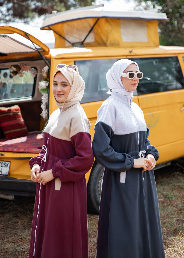 تفصيل اللونين يمنح تباينًا راقيًا يعكس ذوقًا أنثويًا هادئًا، والأكمام المنفوخة مع التجميع المطاطي تضيف لمسة من العصرية والراحة 💫