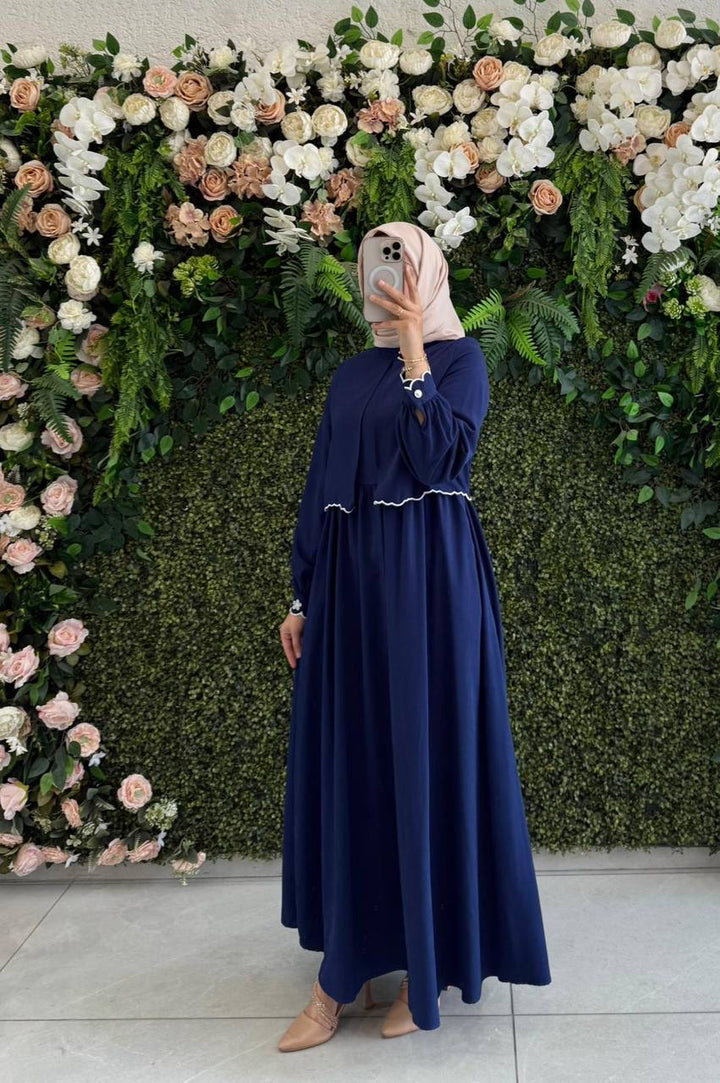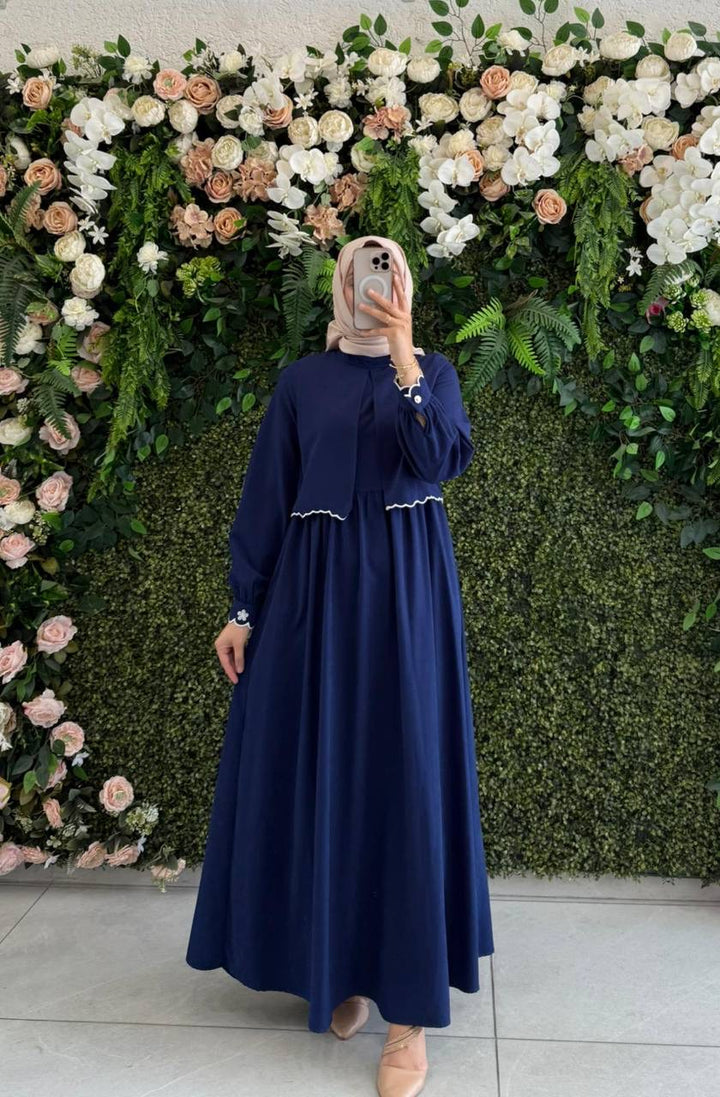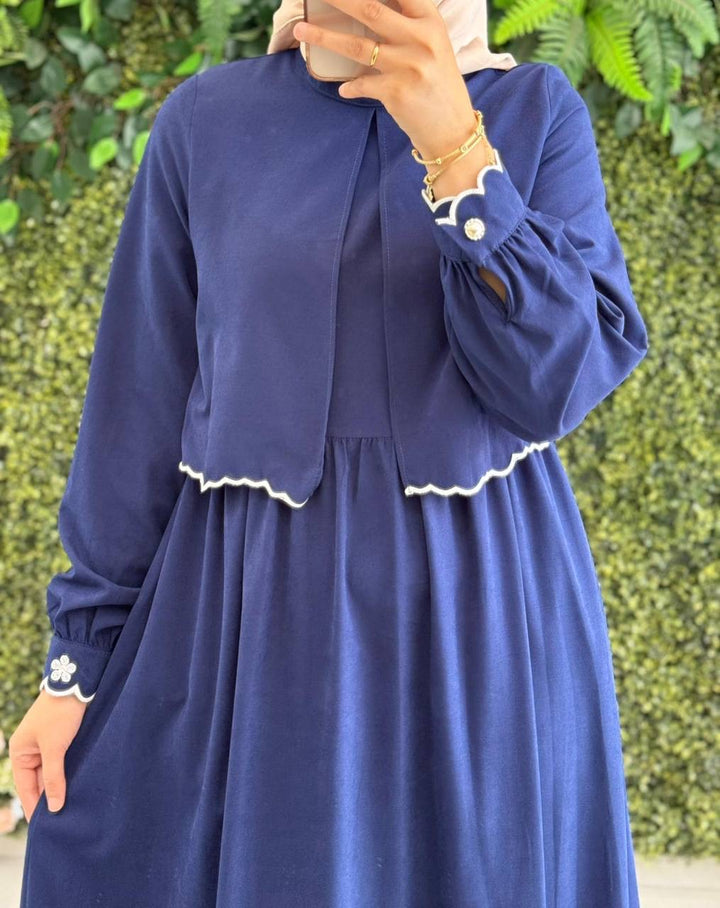 قَصّته من قطعتين متصلتين تعطي مظهر فستان مع جاكيت قصير بنفس القماش، تنتهي حواف الطبقة العلوية بتطريز مموج ناعم يبرز الخصر بجمالية أنثوية.