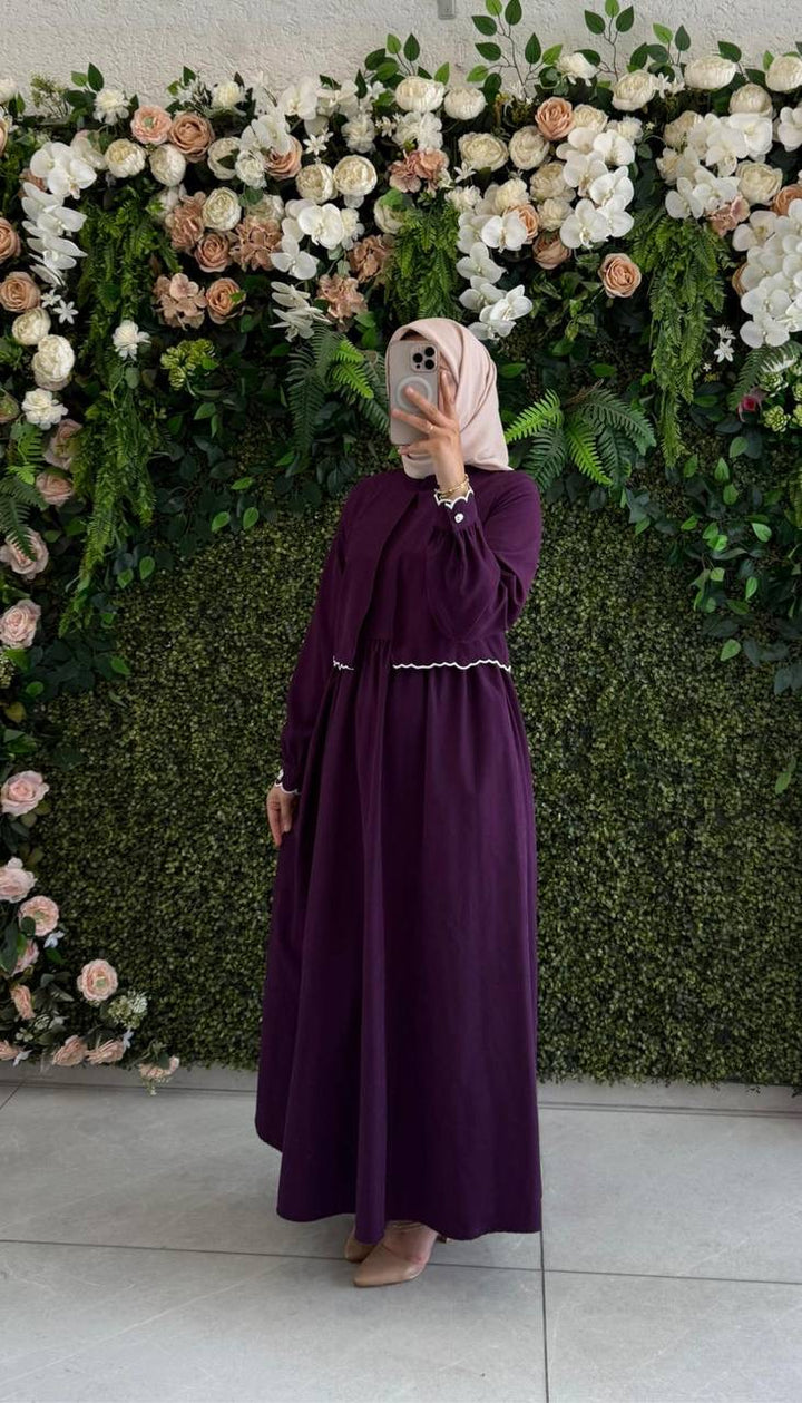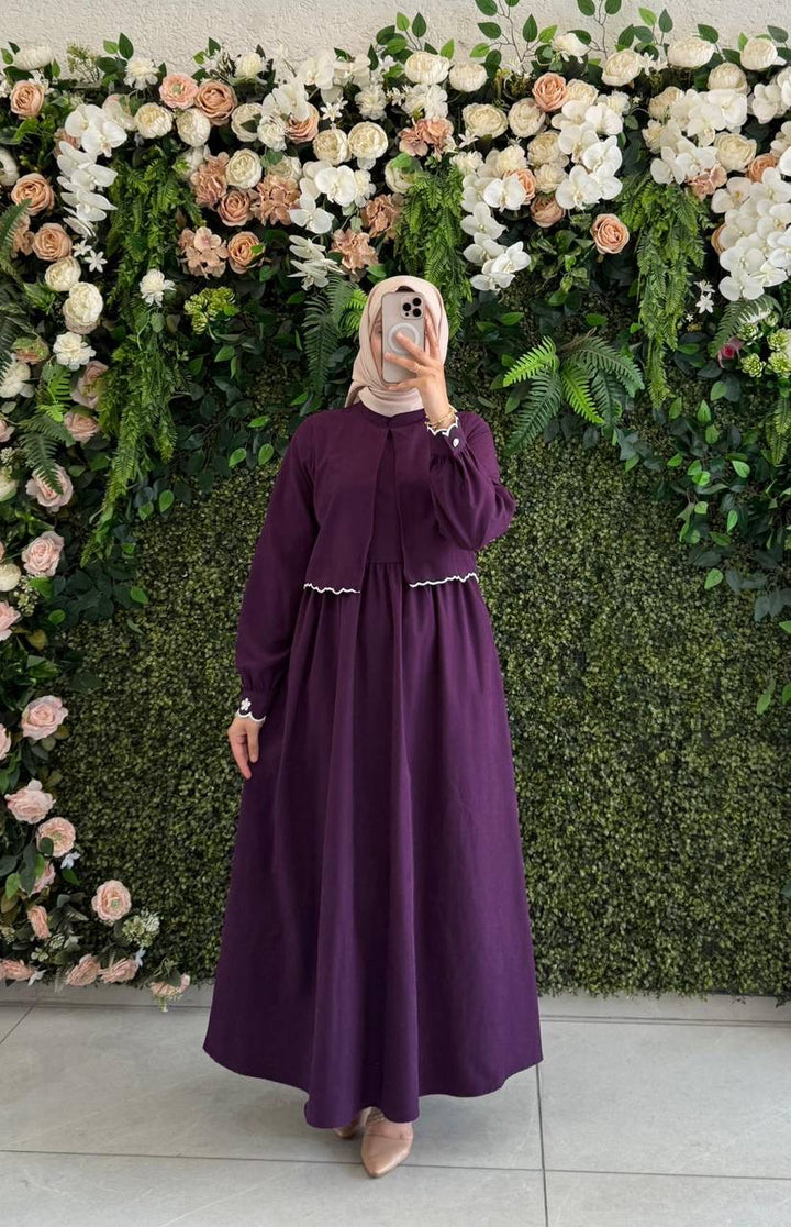 قَصّته من قطعتين متصلتين تعطي مظهر فستان مع جاكيت قصير بنفس القماش، تنتهي حواف الطبقة العلوية بتطريز مموج ناعم يبرز الخصر بجمالية أنثوية.