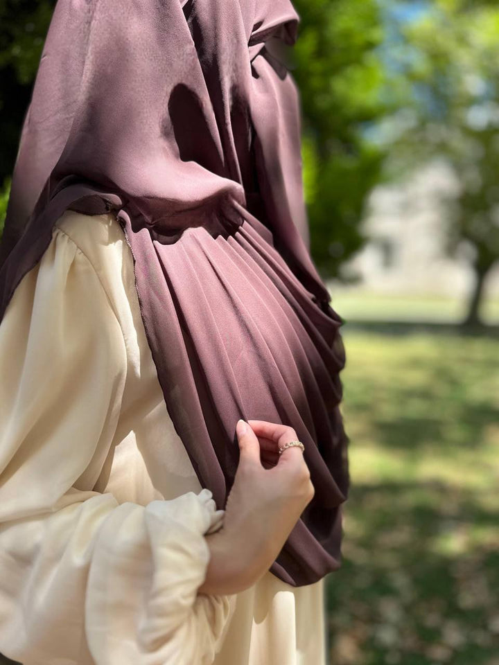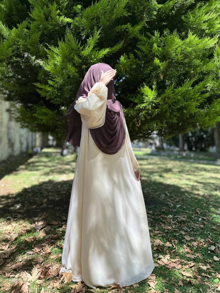 ▫️ حرملة فاخرة بقصة ملكية: قطعة واحدة بتفاصيل دقيقة، قصّة ناعمة وانسيابية، بأكمام واسعة مطوية تعكس فخامة التصميم وسهولة الحركة. مصنوعة من شيفون كوري نخب أول يدمج بين الانسيابية والراحة.