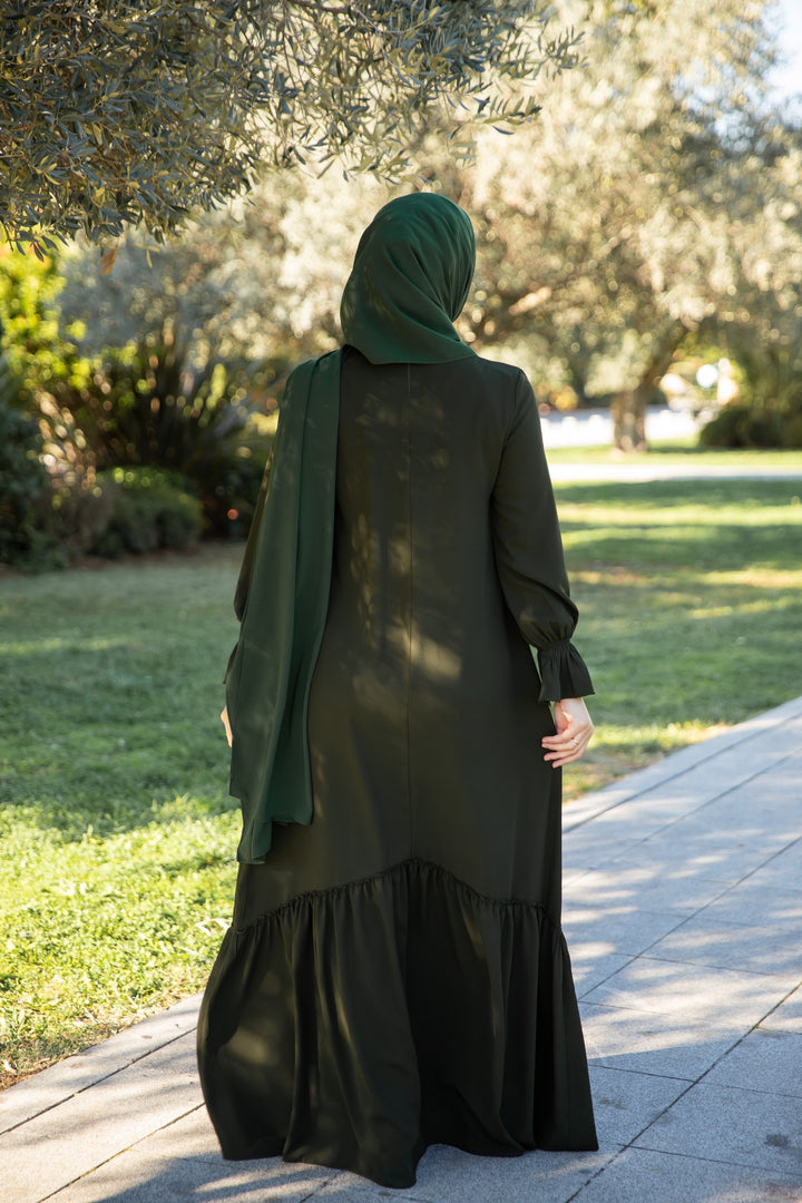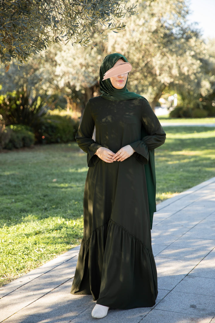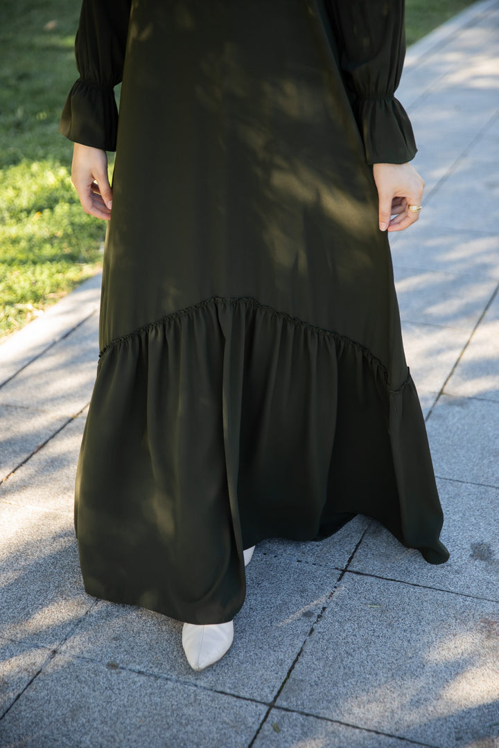 قصة واسعة بانسيابية ناعمة، مع كشكش سفلي أنثوي يضفي حركة راقية للفستان.
