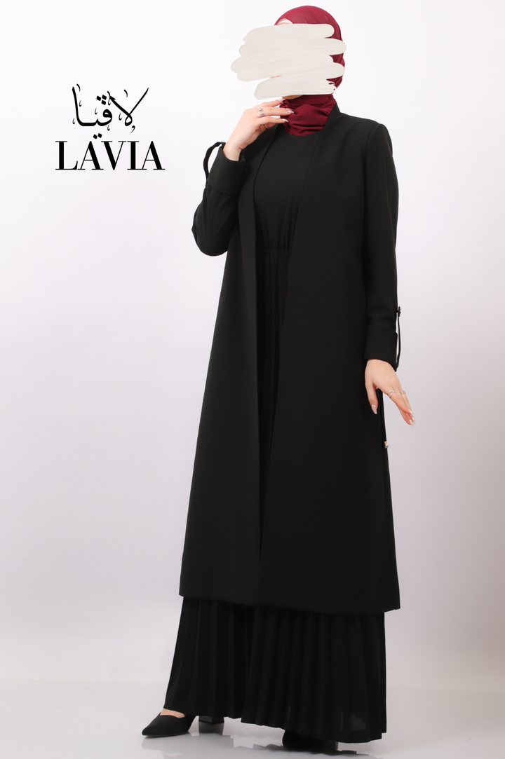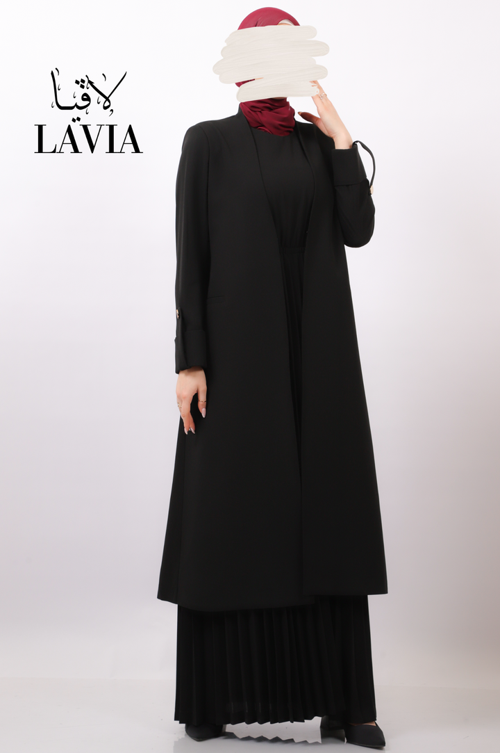 الجاكيت الطويل مع الحزام يعطي توازن وأناقة، والفستان الداخلي بطيّات ناعمة بضيف انسيابية ونعومة لكل خطوة.💕