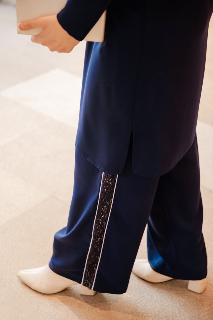 👖 البنطال: واسع ومريح بتفصيلة لامعة على الجوانب تعكس الضوء برقيّ.