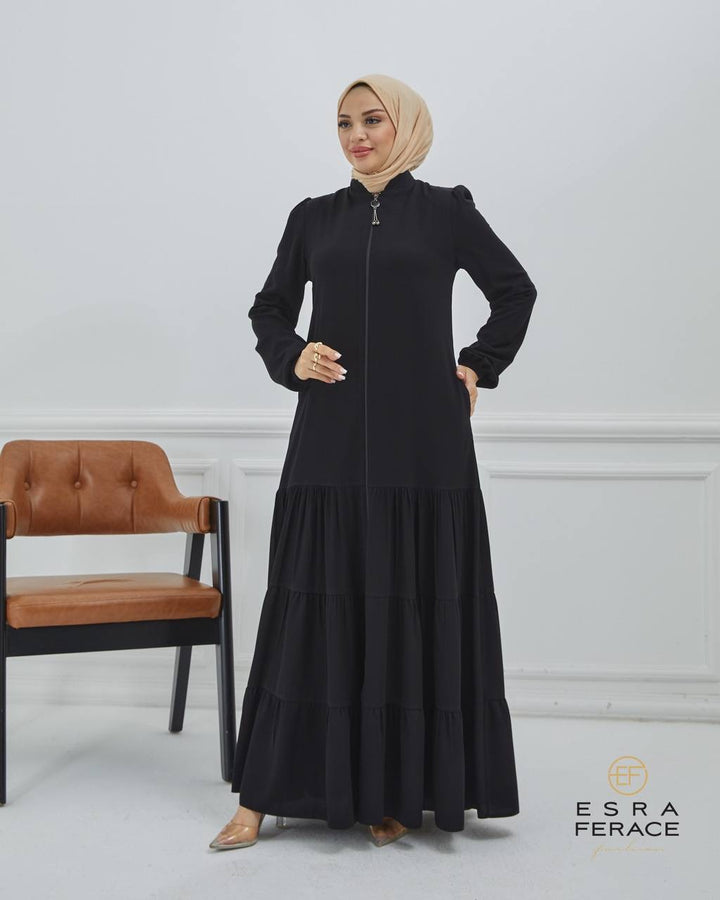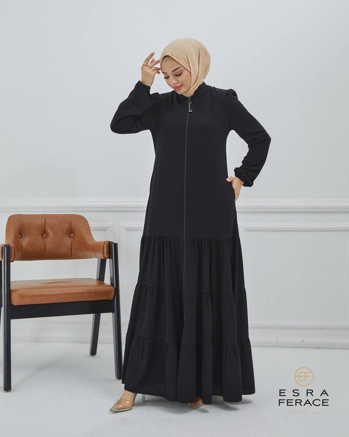 • الموديل: تصميم سحاب أمامي عملي بطول العباية، مع ياقة مغلقة وأكمام بلمسة ناعمة من النفخة الخفيفة