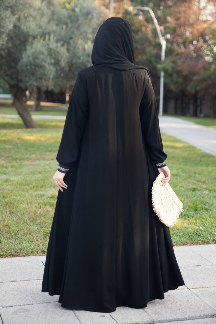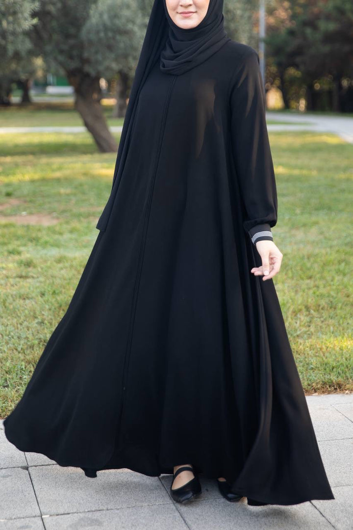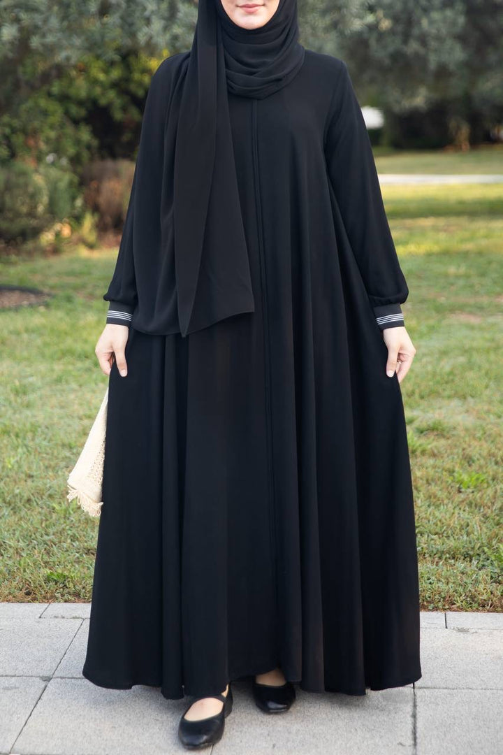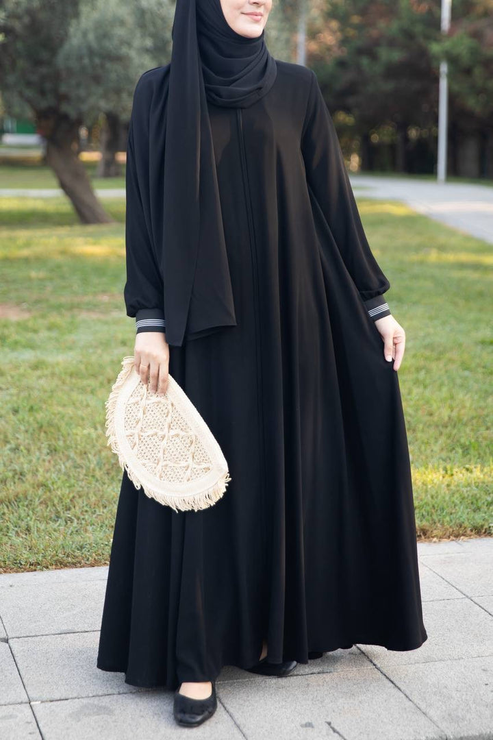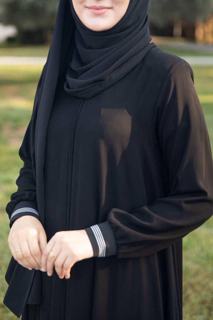 عباية سوداء أنيقة بتصميم انسيابي واسع يمنحك راحة وأناقة في كل حركة. تتميز بأكمام مطرزة بخطوط رفيعة باللون الرمادي عند المعصم تضيف لمسة ناعمة وفاخرة للتصميم.