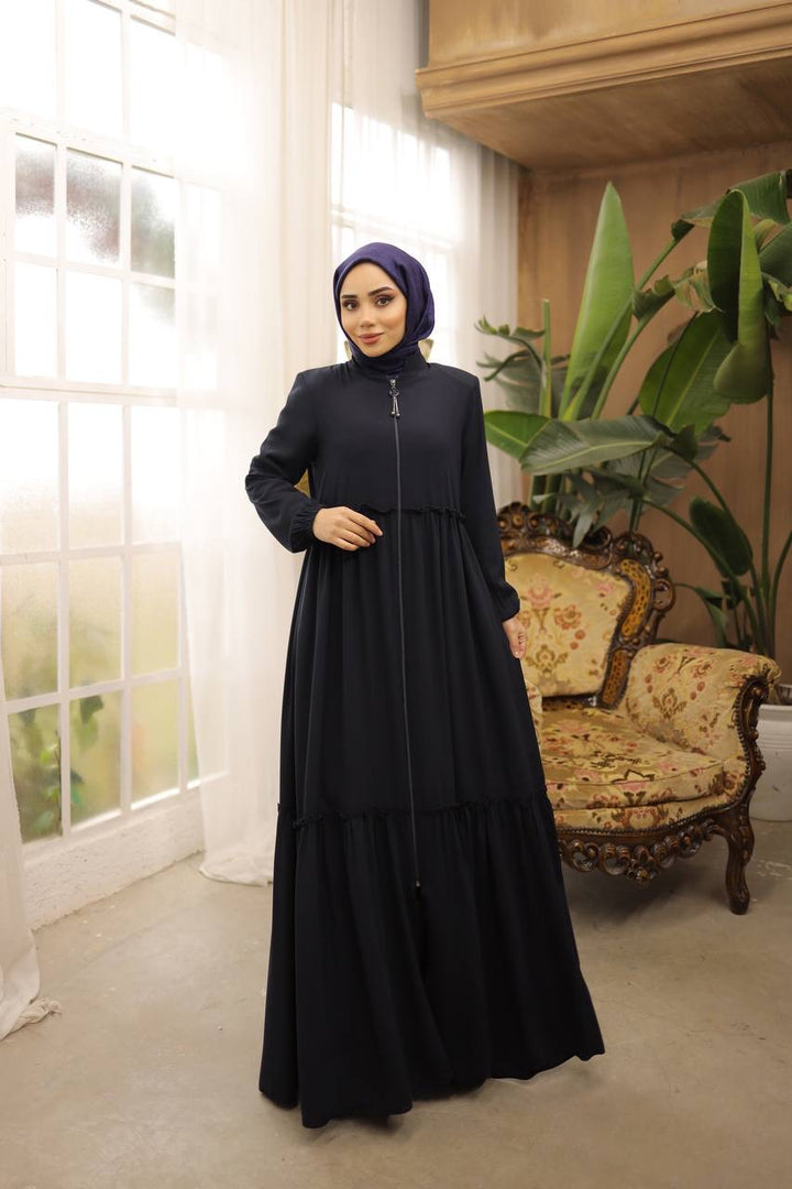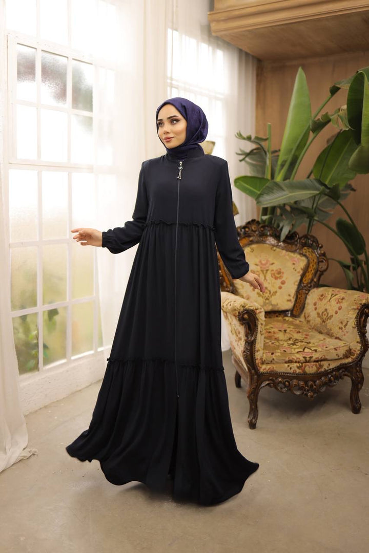 العباية مزينة بطبقتين منفصلتين بكسرات خفيفة تبدأ من أسفل الخصر وتنسدل بنعومة لغاية الأرض، بتمنح العباية شكل ملوكي مريح وفضفاض بدون مبالغة، وبنفس الوقت تعزز الإحساس بالحركة والرشاقة 👣
