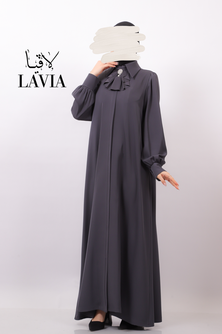 الياقة مزينة بربطة أنيقة 🎀 مع بروش فاخر 🌸 بتمنح لمسة ملكية مميزة، والأكمام الواسعة مع الكشكشة عند المعصم بتضيف نعومة وانسيابية 👗.