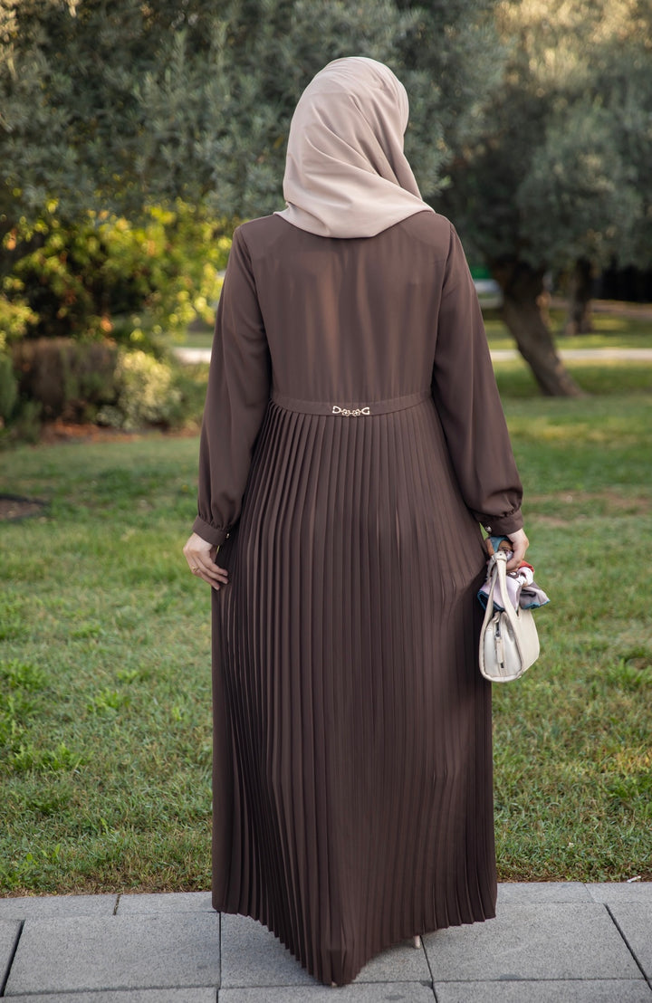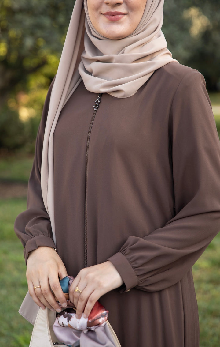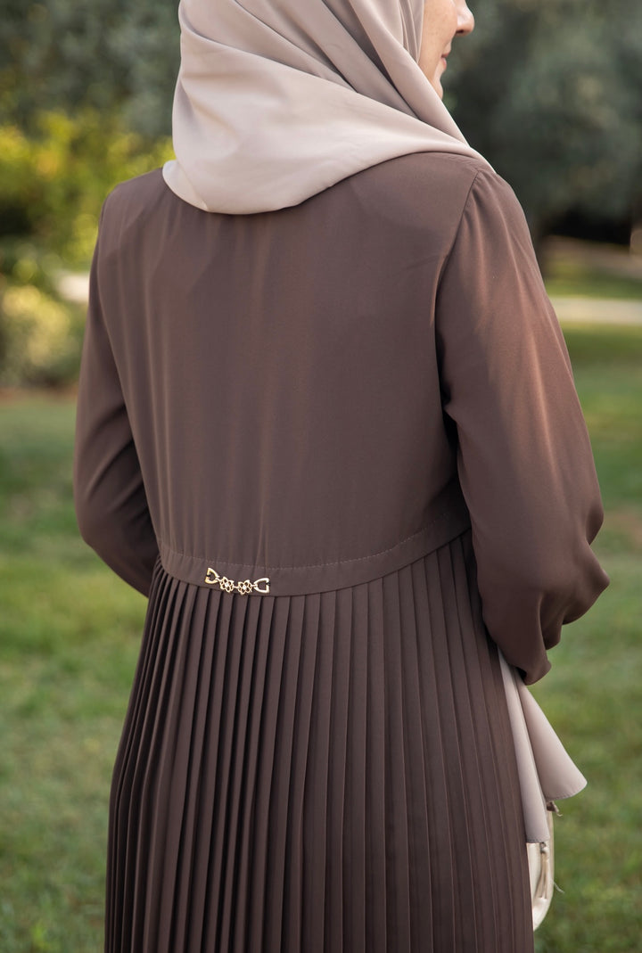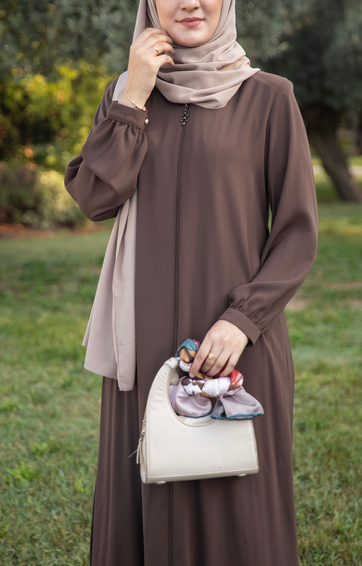 عباية بلون بني كلاسيكي راقٍ، بطول 150 سم من الكتف ، بتصميم انسيابي عملي يجمع بين الأناقة والبساطة.