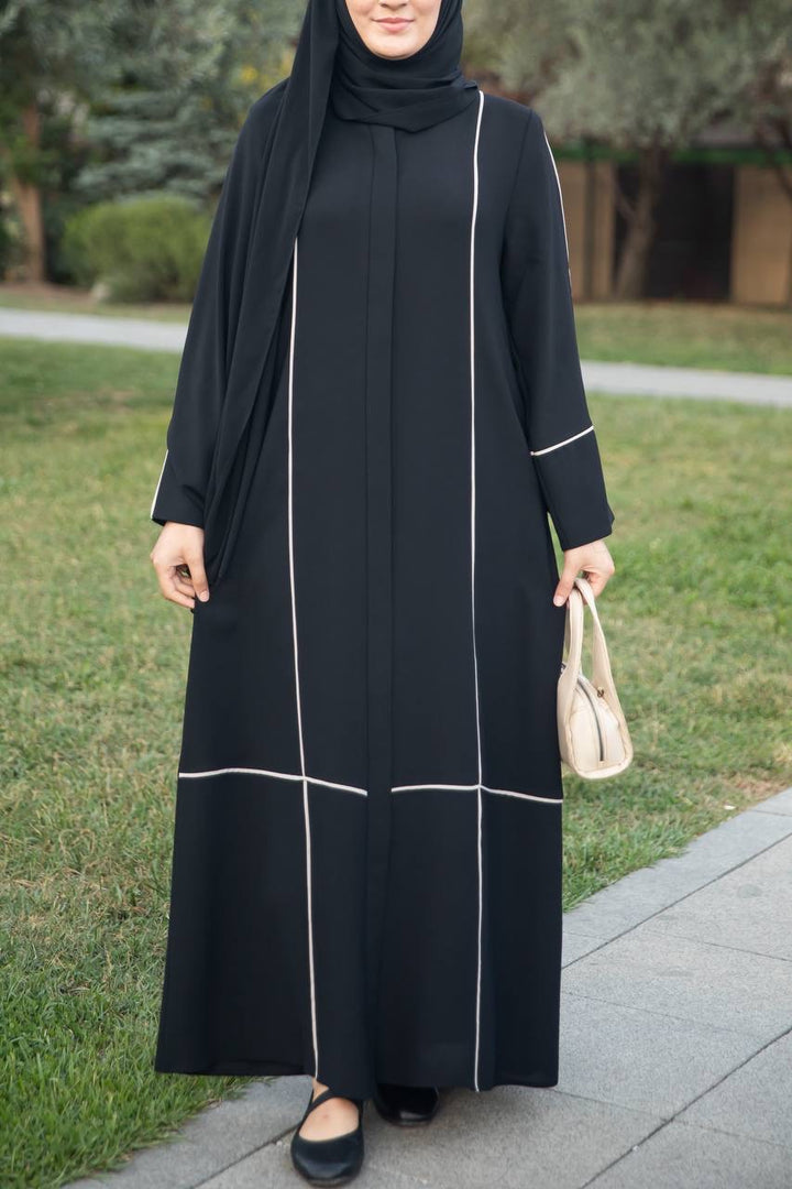 التصميم: يتميز بخطوط طولية وعرضية باللون البيج الفاتح/الأوف وايت، مرسومة بطريقة هندسية تعطي العباية لمسة عصرية وبسيطة.