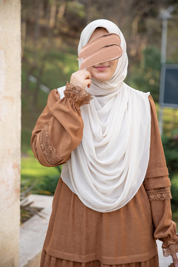 • أكمام منفوشة مع سحابات داخلية مخفية وزخرفة دانتيل فاخرة على الكُمّ.