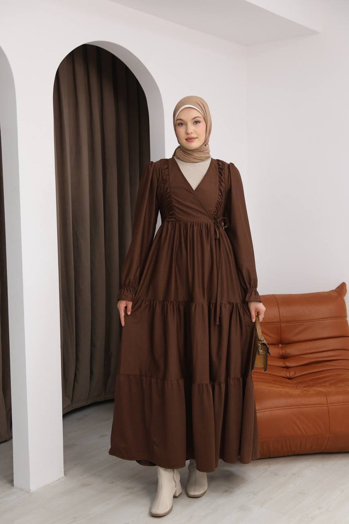 فستان بقصّة لفّ من الاعلى تضيف توازن وانسيابية للجسم، مع كسرات خفيفة على الأكمام وتفاصيل تجمع بين الكلاسيكية والعصرية.