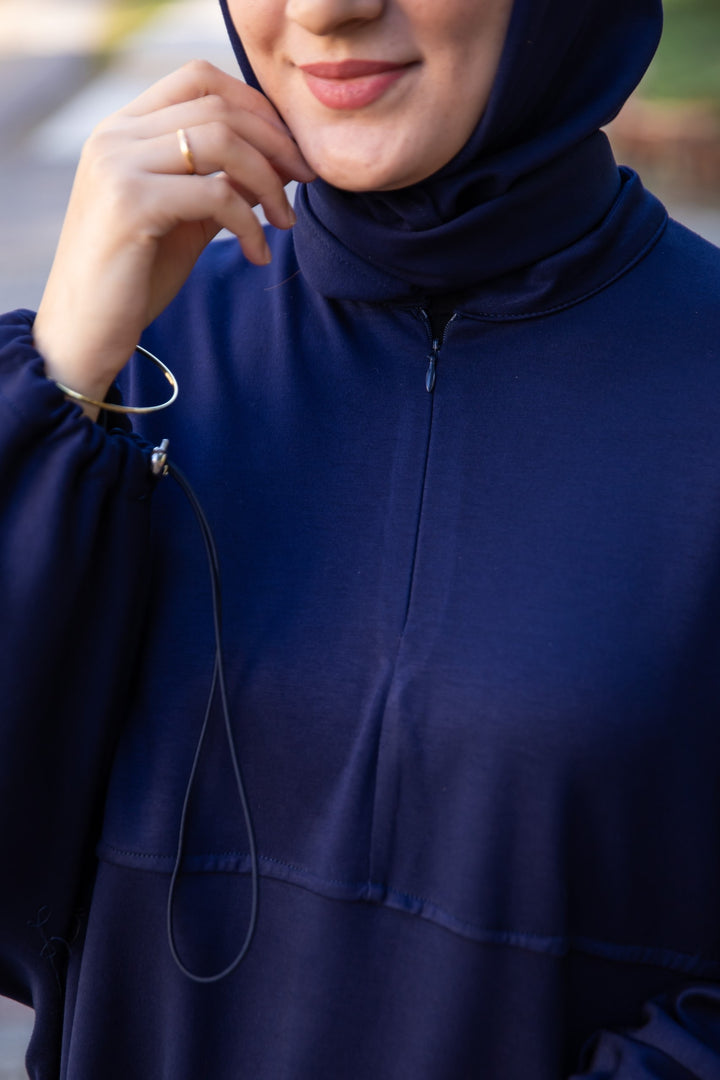 قصة انسيابية بوسع مريح، مع قبعة مدمجة تنتهي بربطة أنيقة على الرقبة تمنح الفستان لمسة عصرية محافظة.