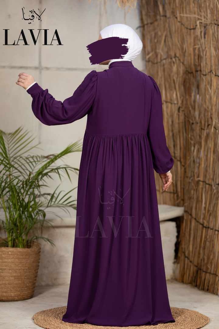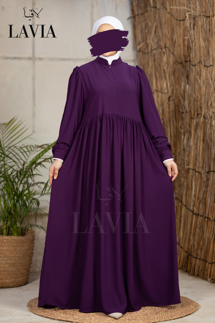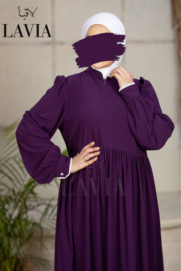 أكمام منفوشة مزينة بدانتيل أنيق على الكم، مع سحاب مخفي من الأمام لسهولة اللبس ولمسة عملية أنيقة.