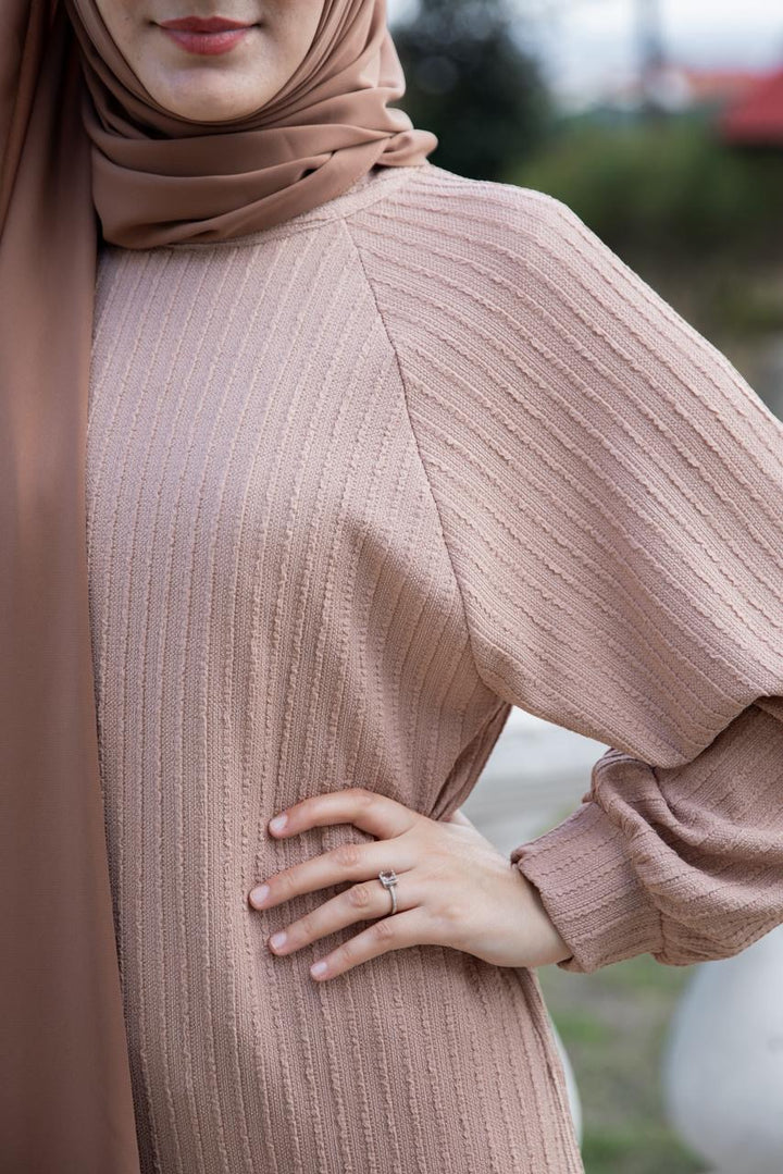 مصنوع من قماش خريفي دافئ بنقشة خطوط بارزة ناعمة تضيف بعدًا فخمًا للتصميم.