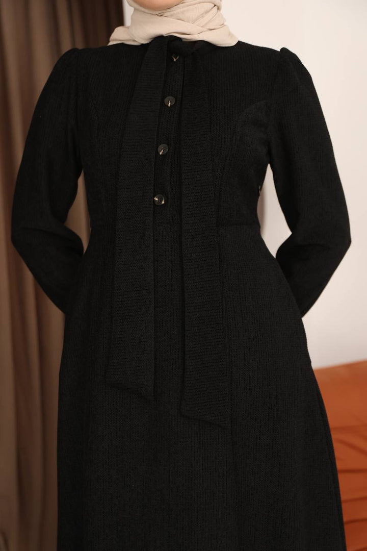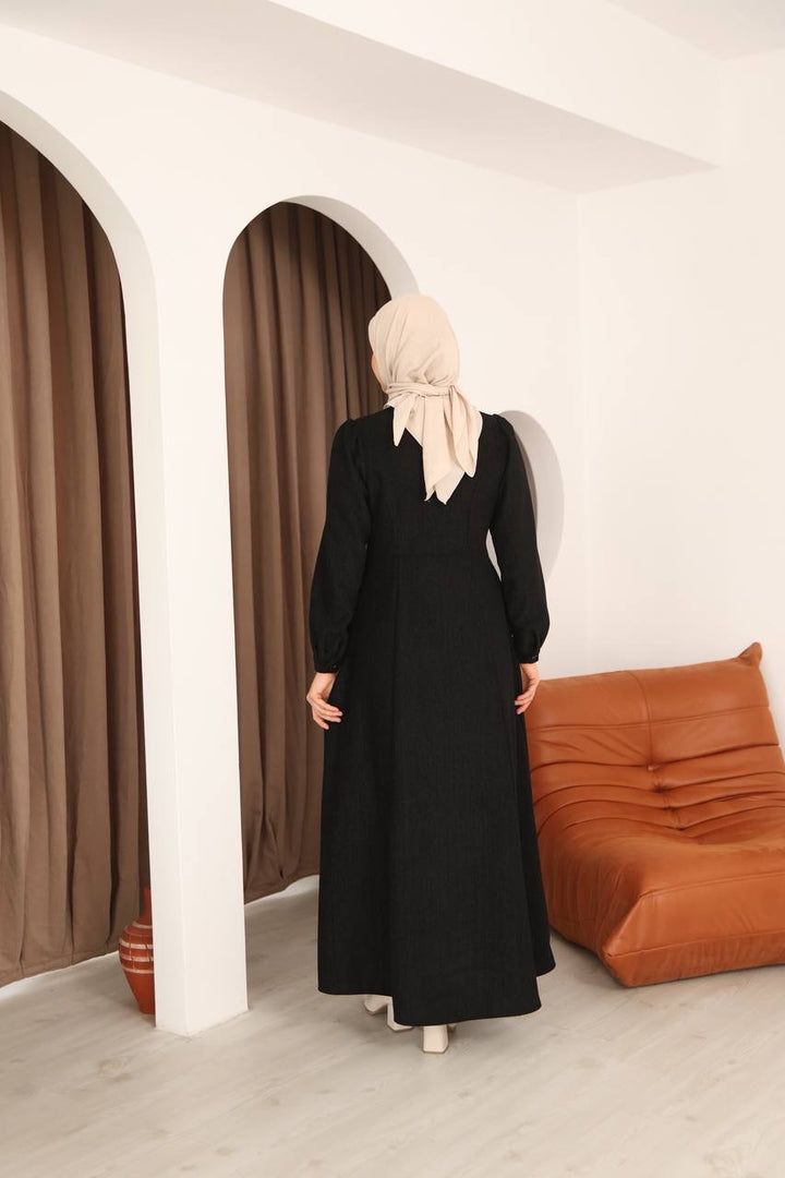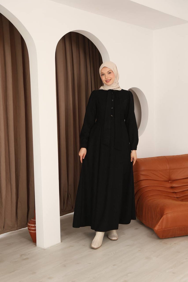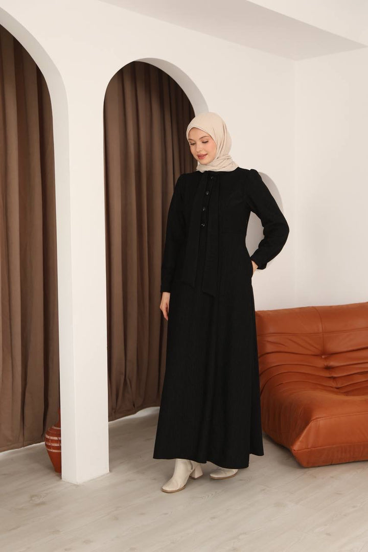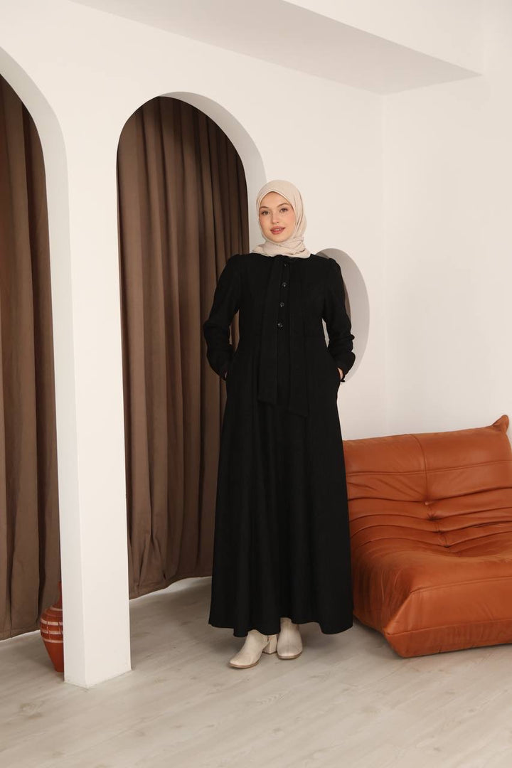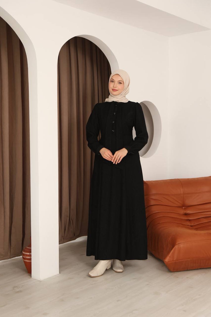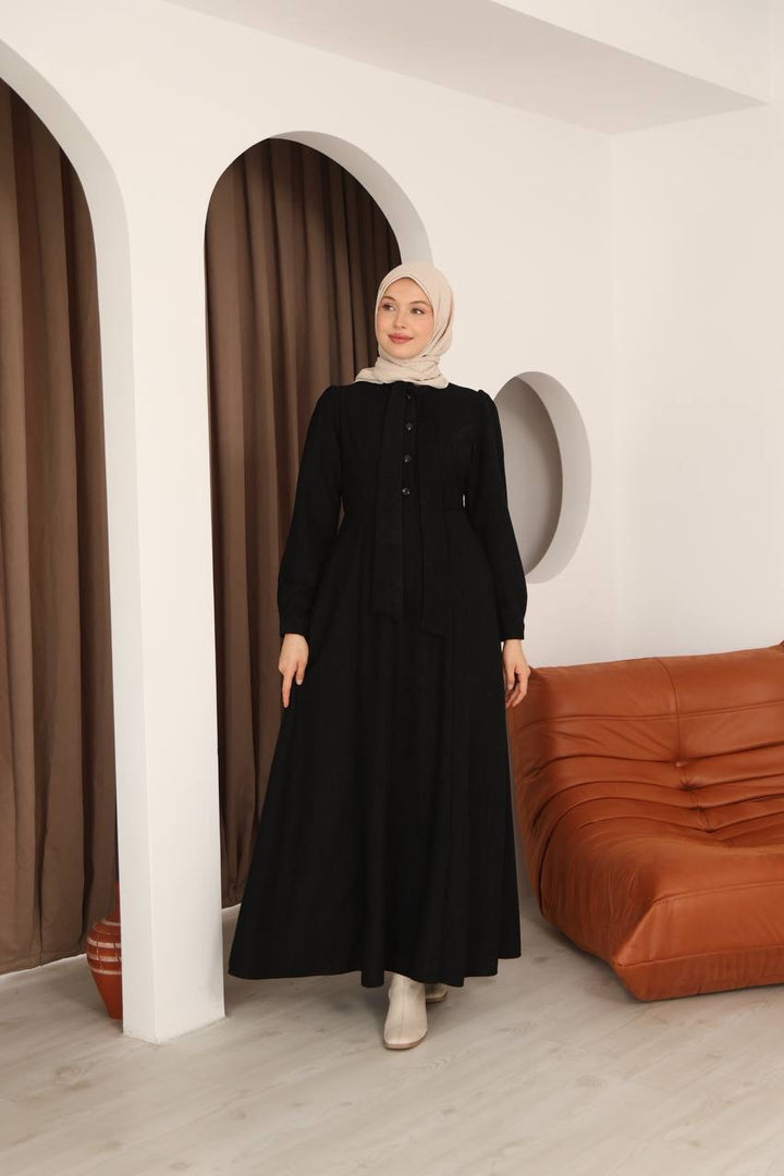 مع أزرار أمامية وخياطة دقيقة تمنح الفستان طابعًا كلاسيكيًا فاخرًا.