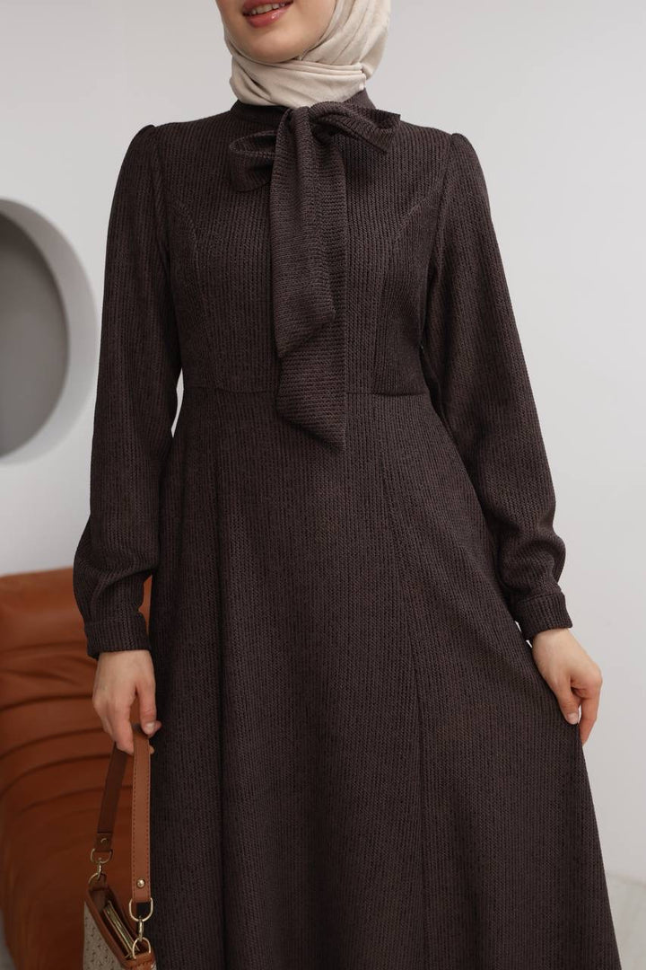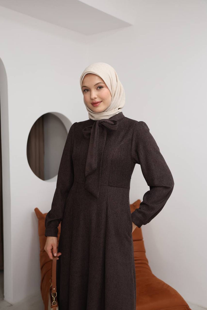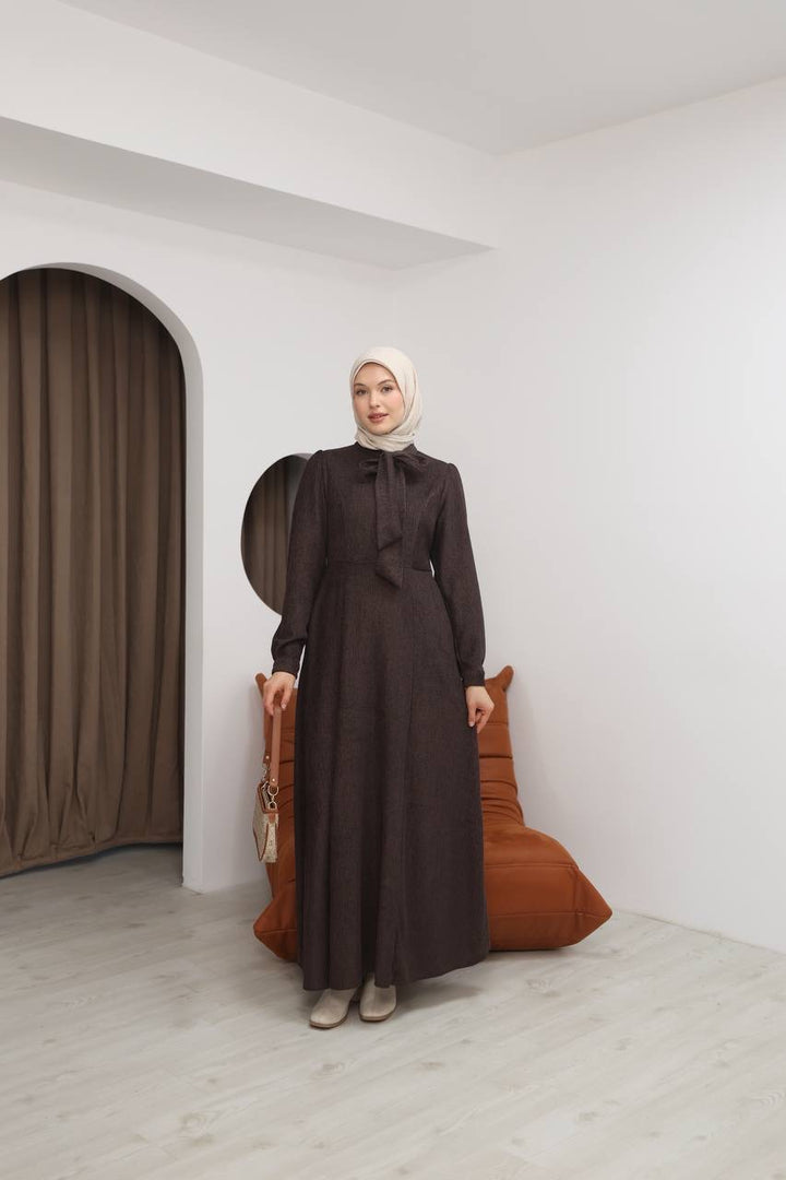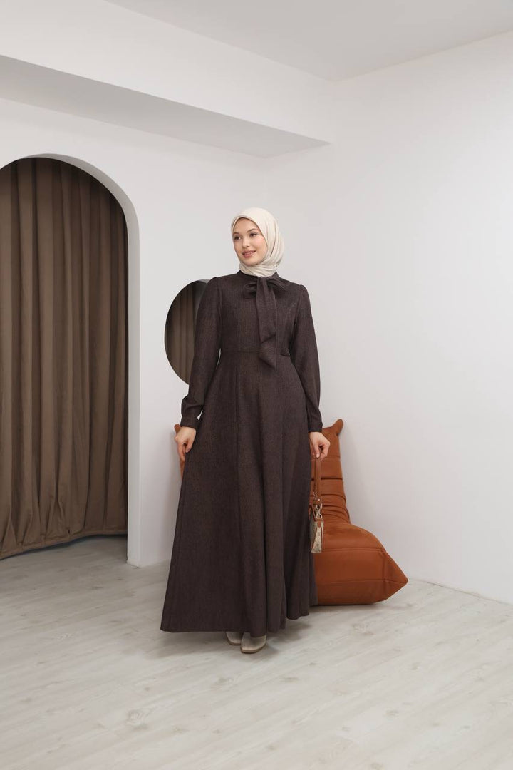 فستان طويل بقصّة محتشمة تبرز الخصر بانسيابية،