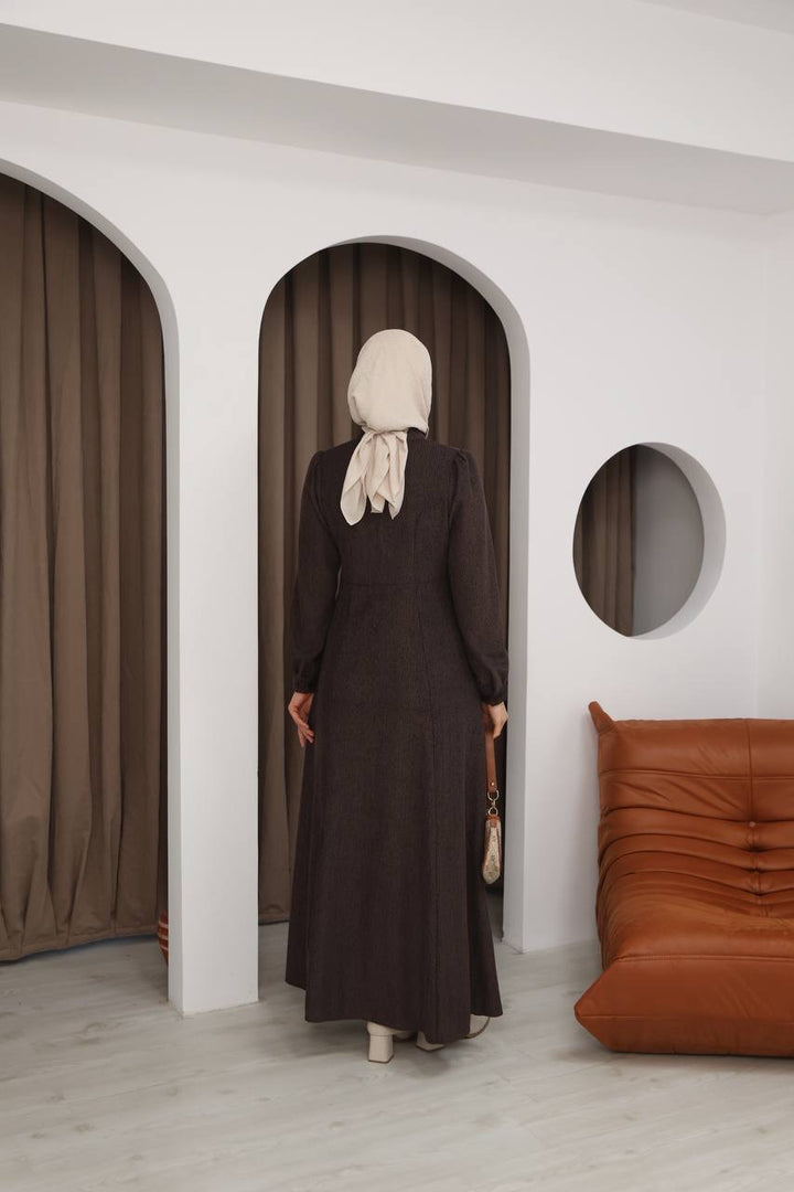 مع أزرار أمامية وخياطة دقيقة تمنح الفستان طابعًا كلاسيكيًا فاخرًا.