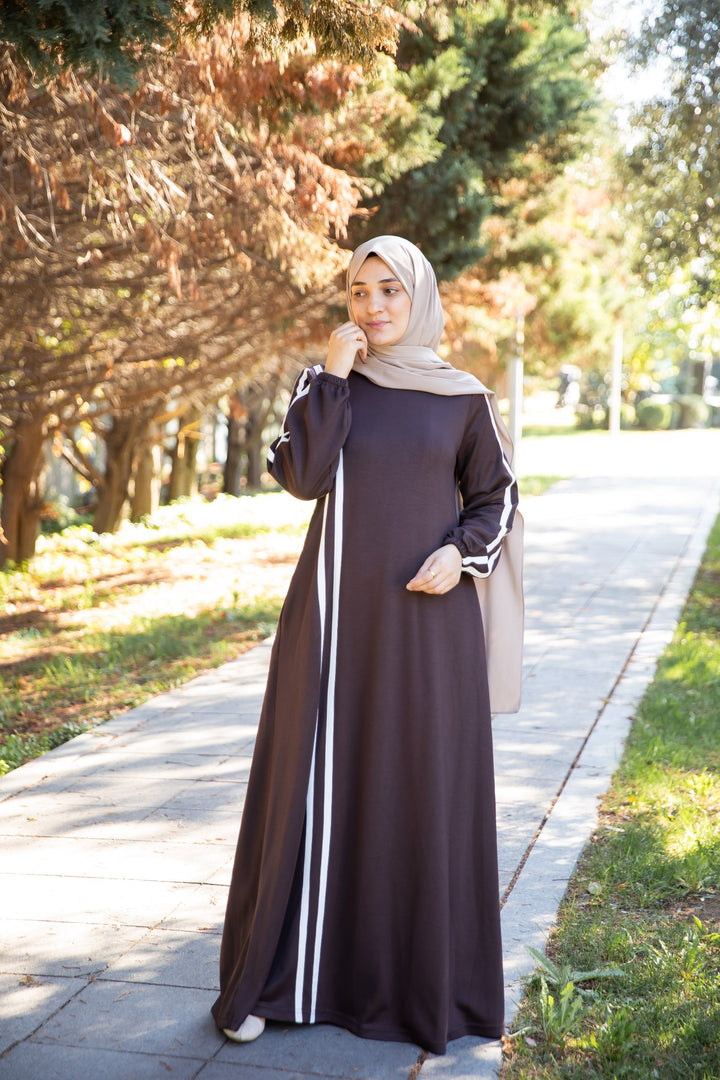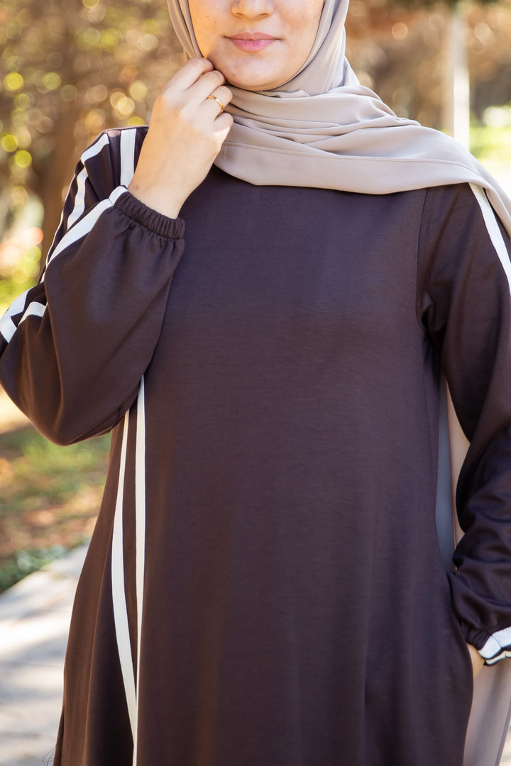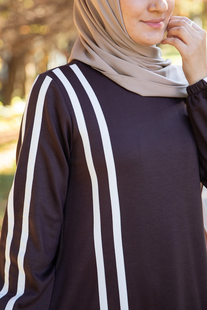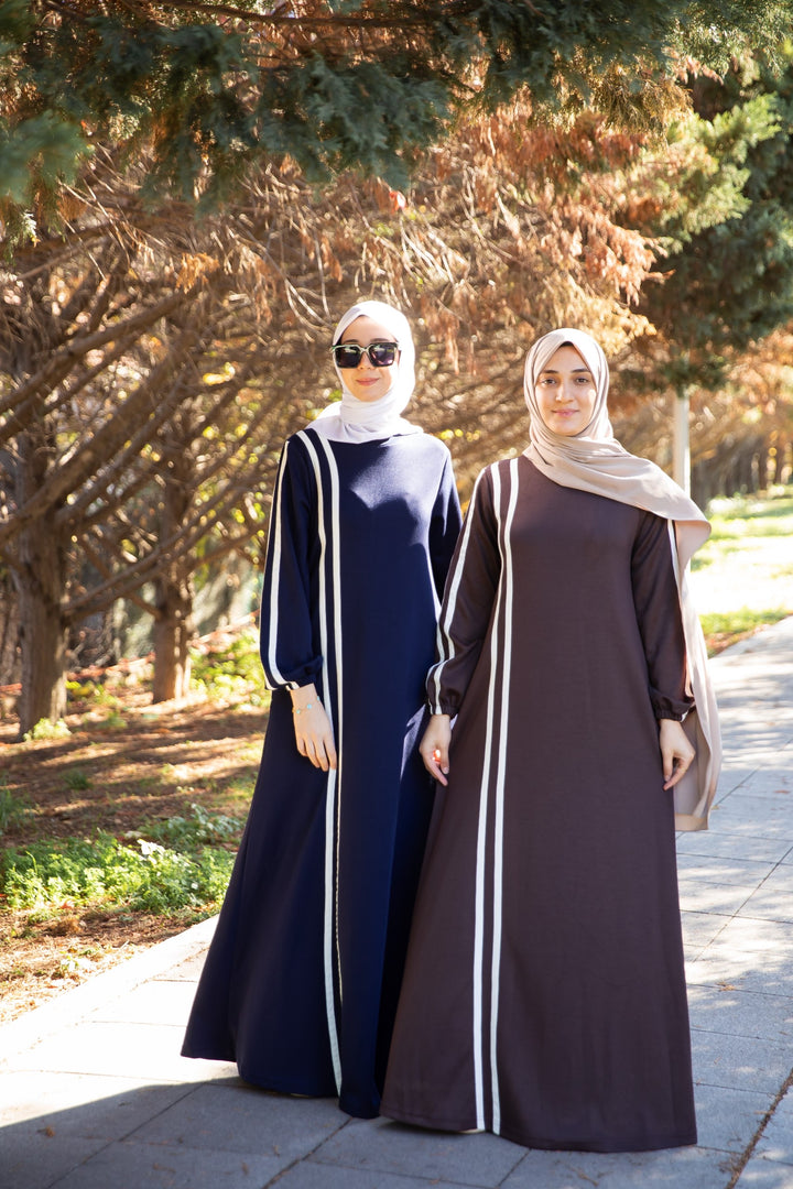 يتميز بخطين جانبيين باللون الأبيض على طول الفستان والأكمام، لتأثير بصري جذاب يطيل القوام ويبرز الأناقة.