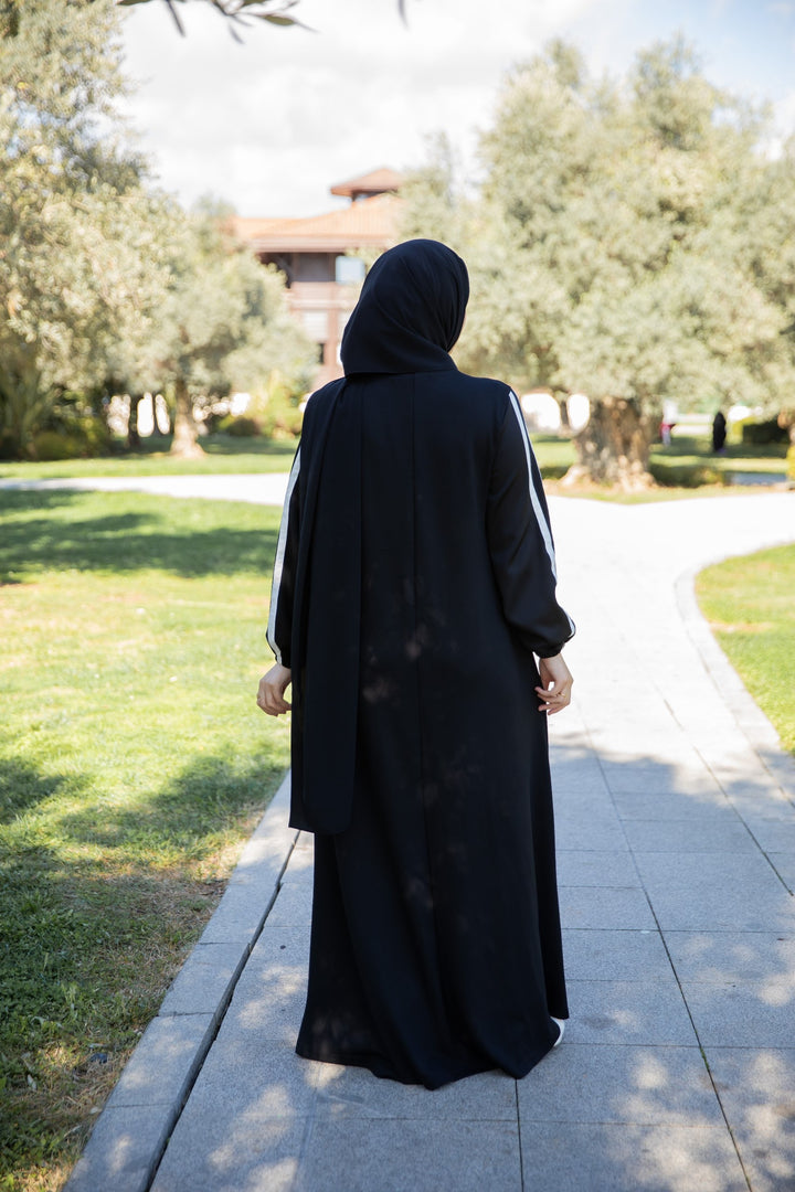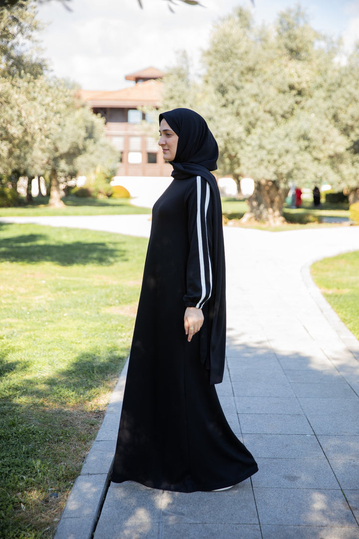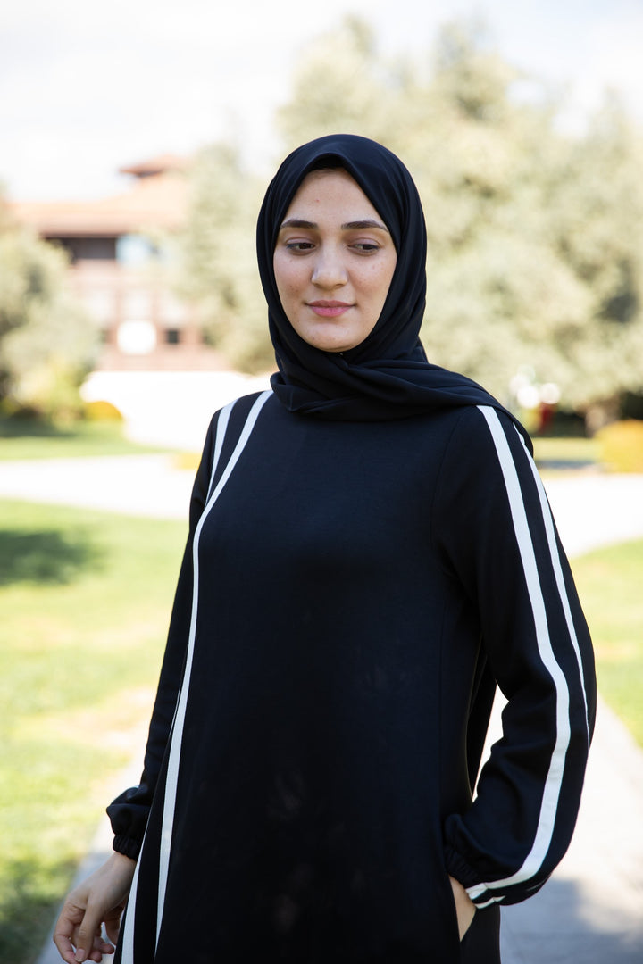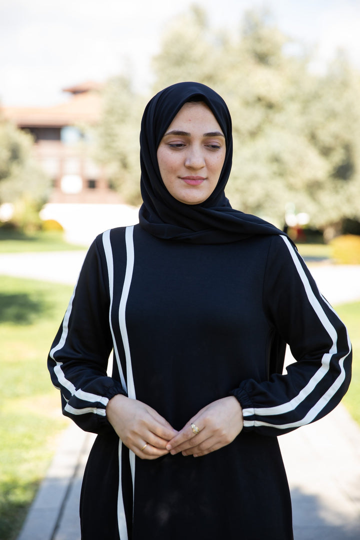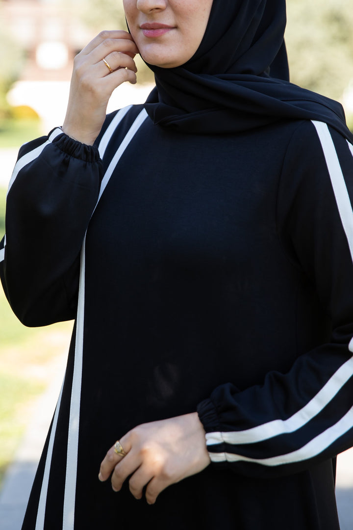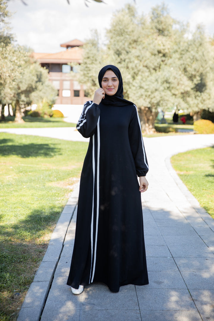 يتميز بخطين جانبيين باللون الأبيض على طول الفستان والأكمام، لتأثير بصري جذاب يطيل القوام ويبرز الأناقة.