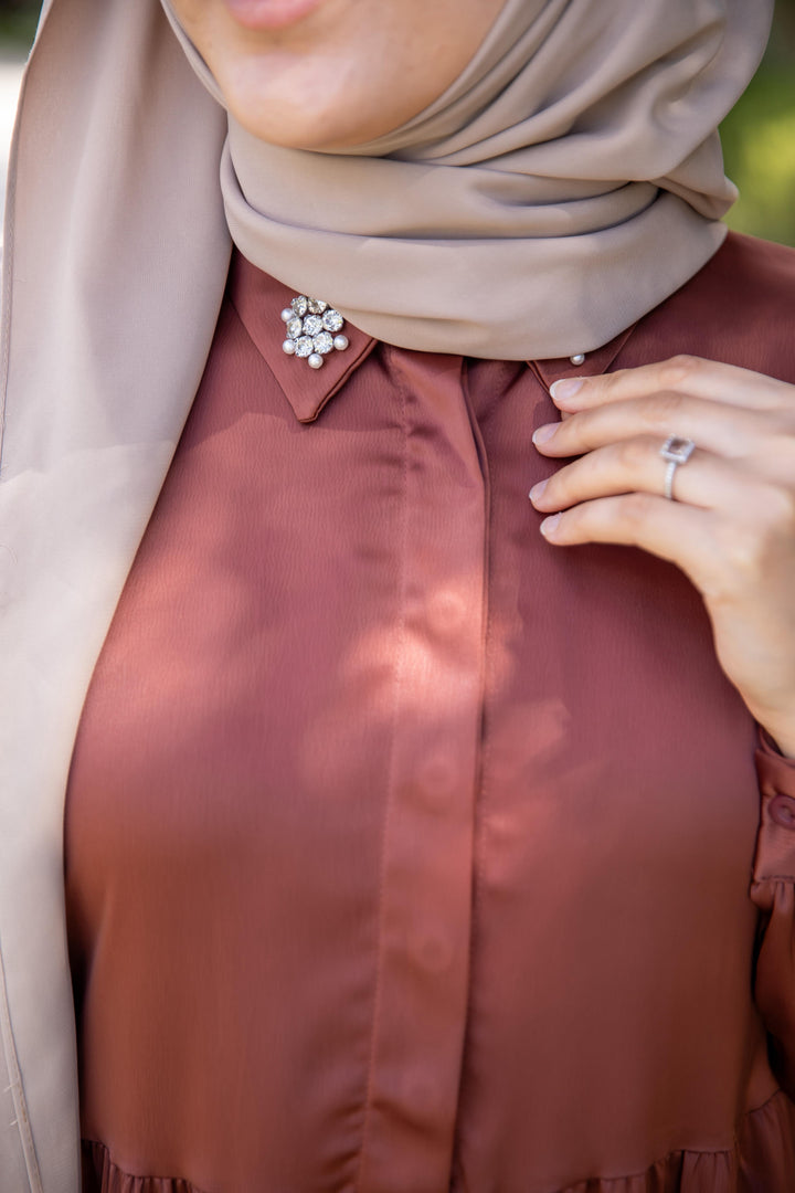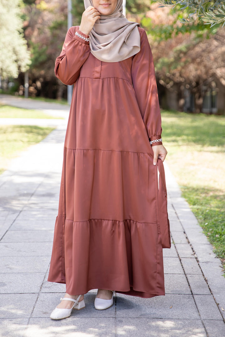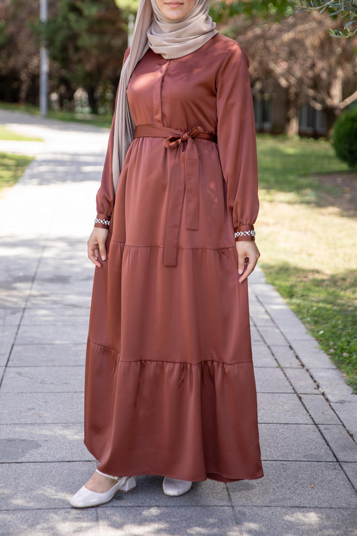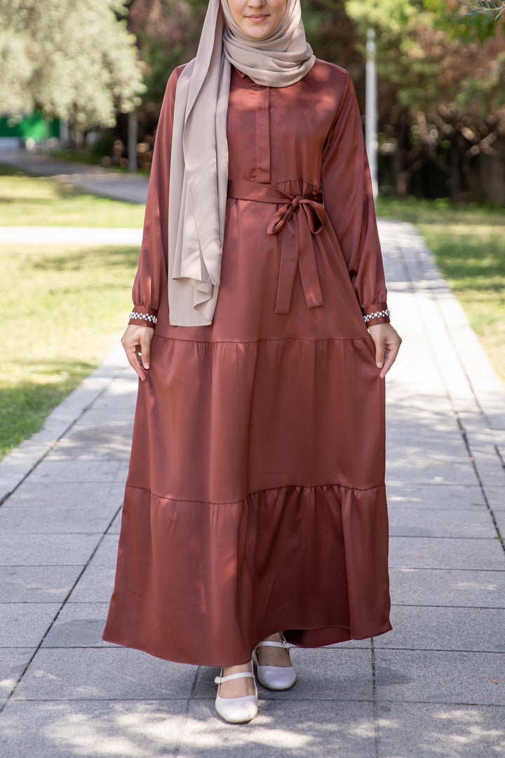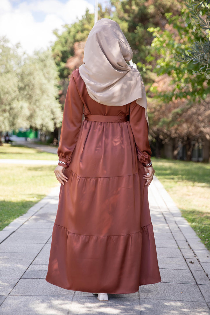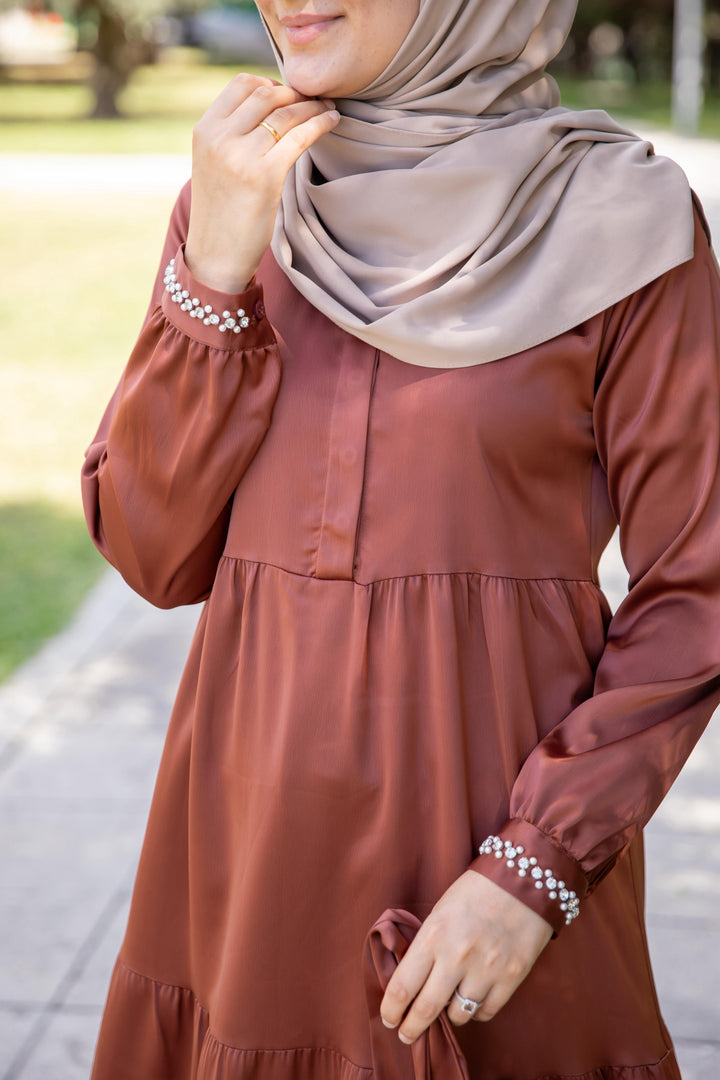 فستان أنثوي محتشم بلون بني نحاسي دافئ 🧡