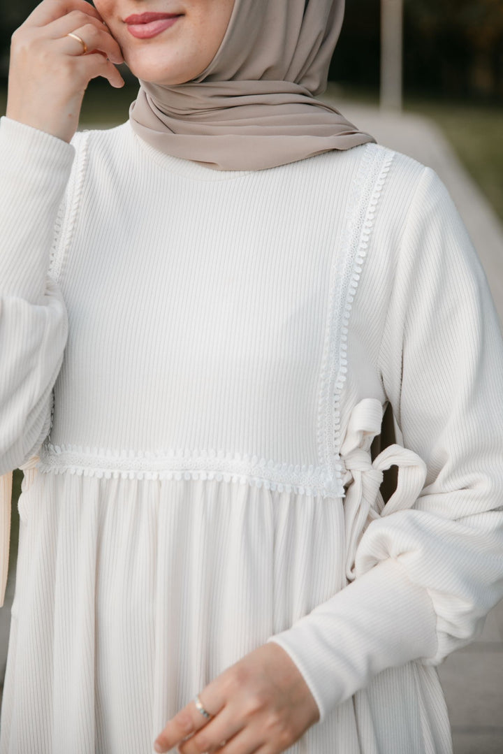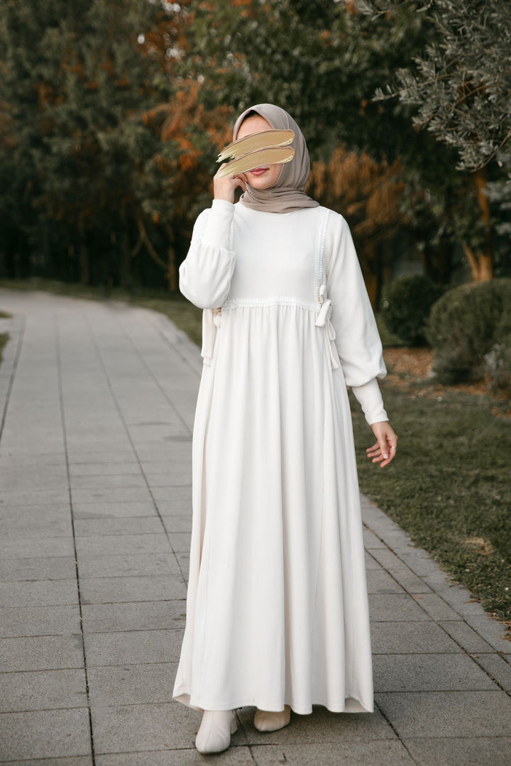 التفاصيل الدقيقة على الصدر وخط الخصر تضيف لمسة أنثوية مرتّبة، مع أكمام واسعة تمنحك راحة وحركة أسهل، وتعطي الفستان طابعًا شتويًا دافئًا ومحتشمًا 👗✨