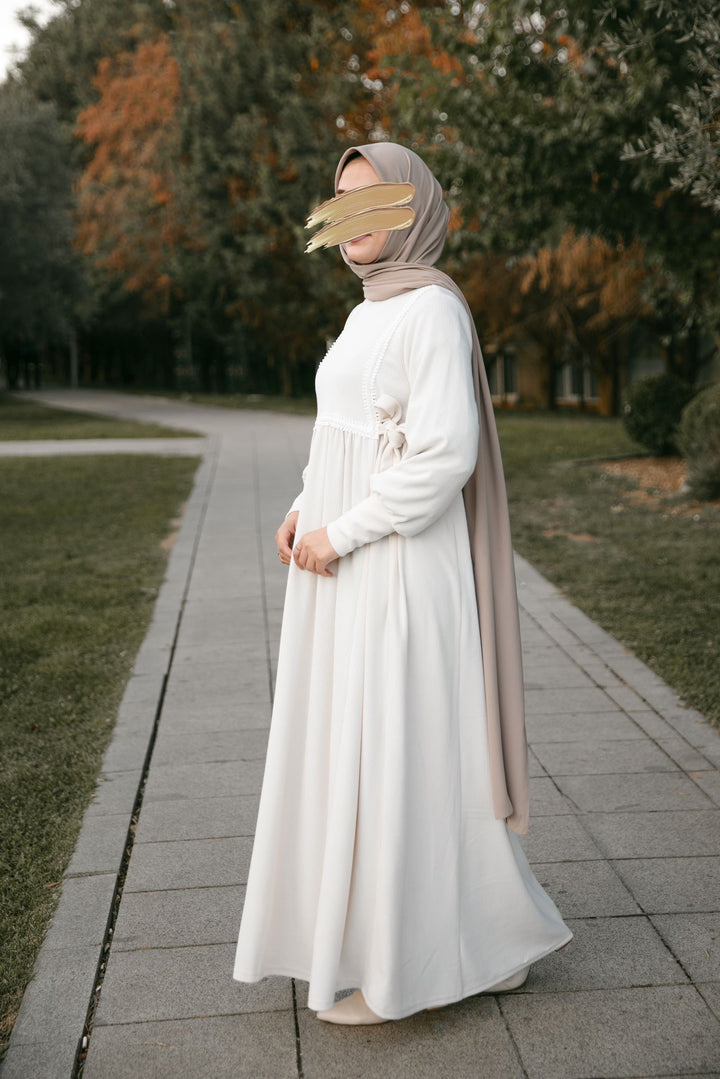 فستان فاطمة يجمع بين الرقي والبساطة بأسلوب ناعم يبرز جمال الإطلالة بدون أي مبالغة.