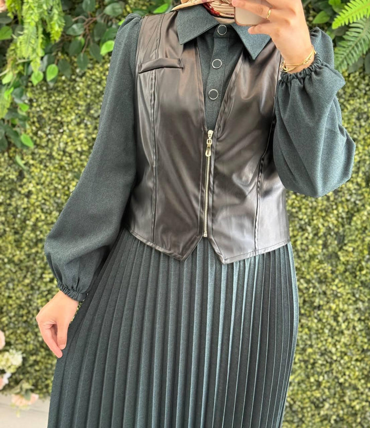 * تنورة بتفصيل كسرات ناعمة تضفي حركة راقية وانسيابية مميزة.* مزوّد بفيست جلدي أنيق يعطي الفستان لمسة عصرية جريئة دون أن يفقد أنوثته.