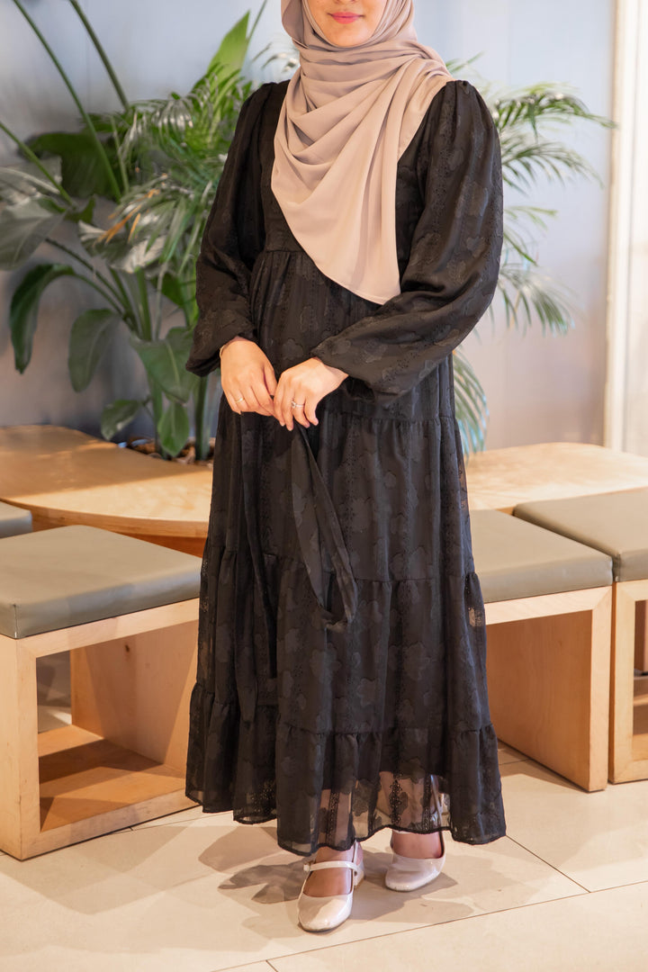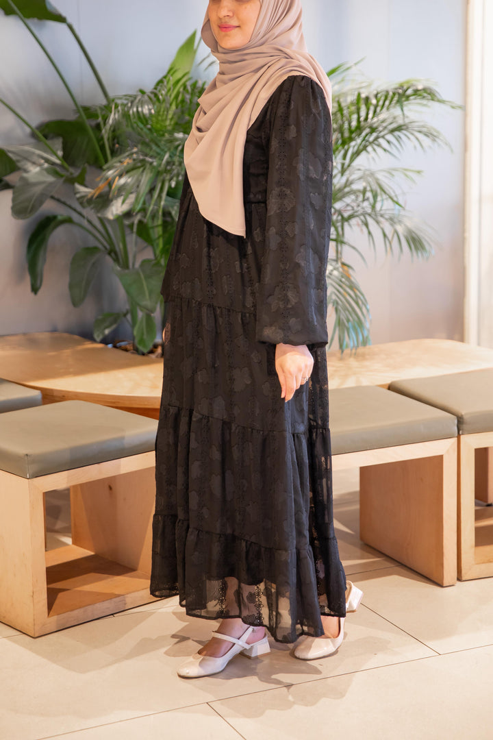 تفاصيل الأكمام الفضفاضة تضيف لمسة كلاسيكية، بينما القماش المنقوش يمنح الفستان جمالًا مميزًا يناسب يومك بإطلالة عملية راقيه 😍