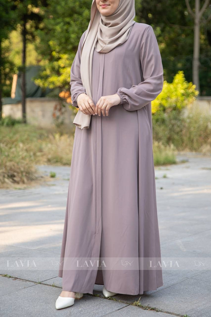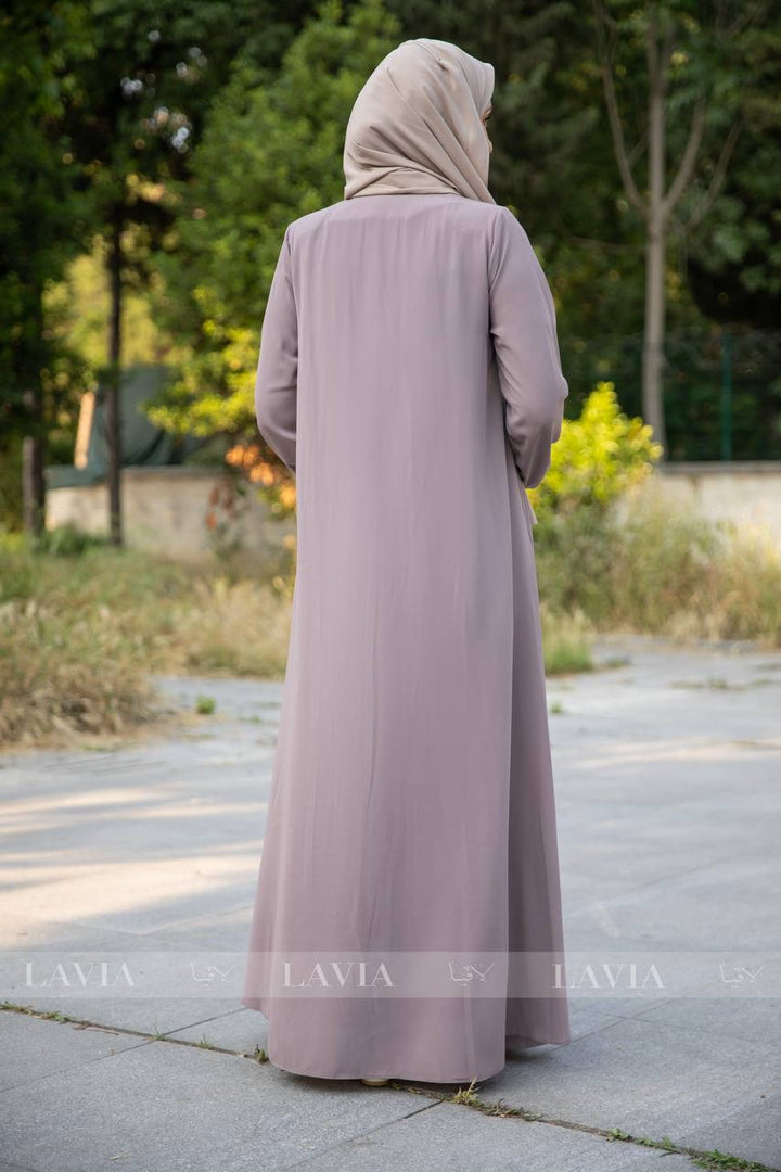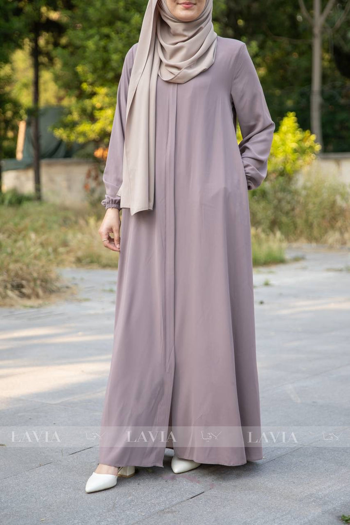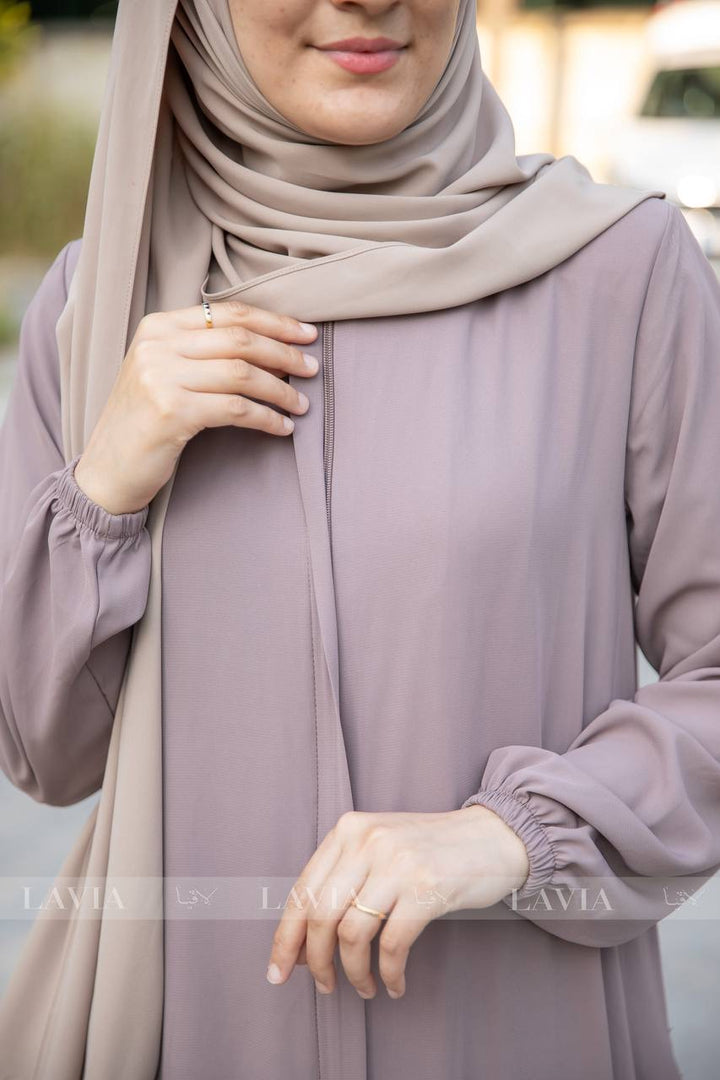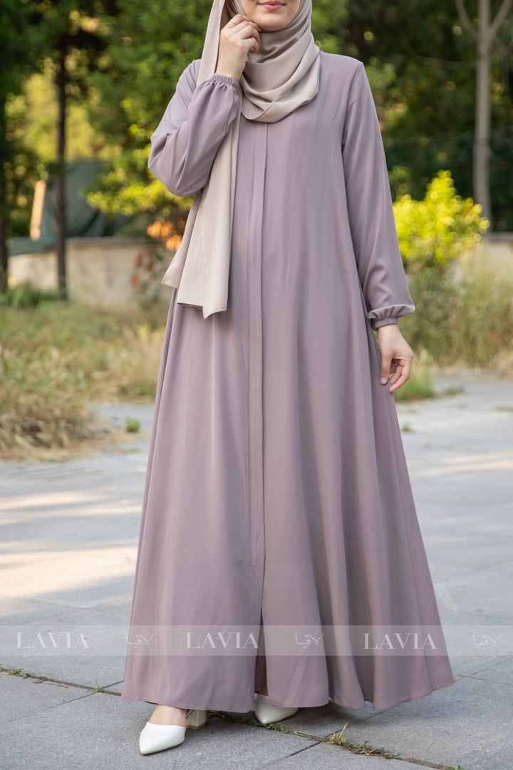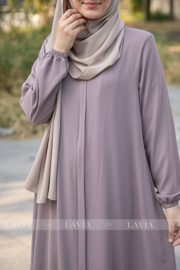 • الواجهة الأمامية: سحاب أمامي مخفي بلطف، عملي للمحجبات والمرضعات، مع خط خياطة طولي يُعزز من طول القوام ويمنحك إطلالة رشيقة.