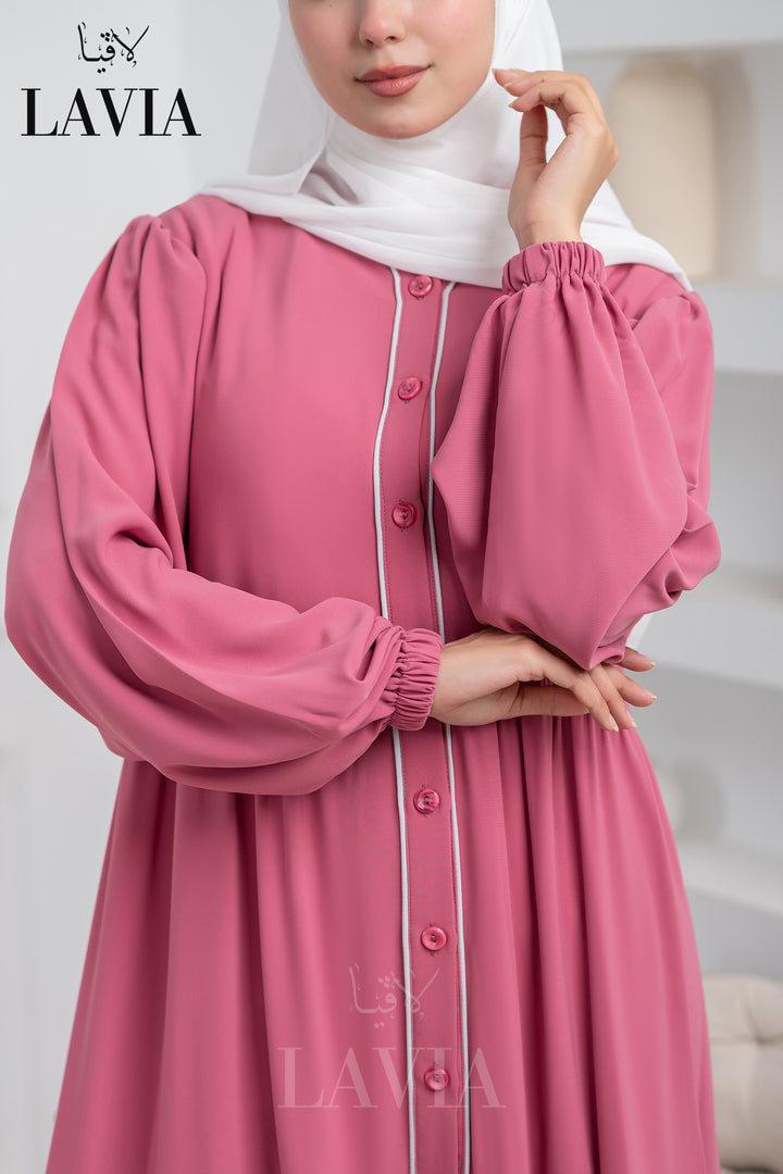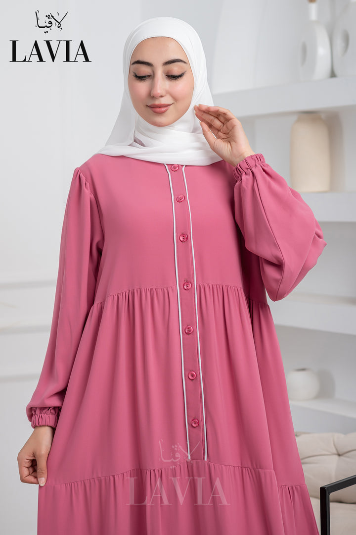 • ياقة دائرية مغلقة تزيد من بساطة الفستان واحتشامه.