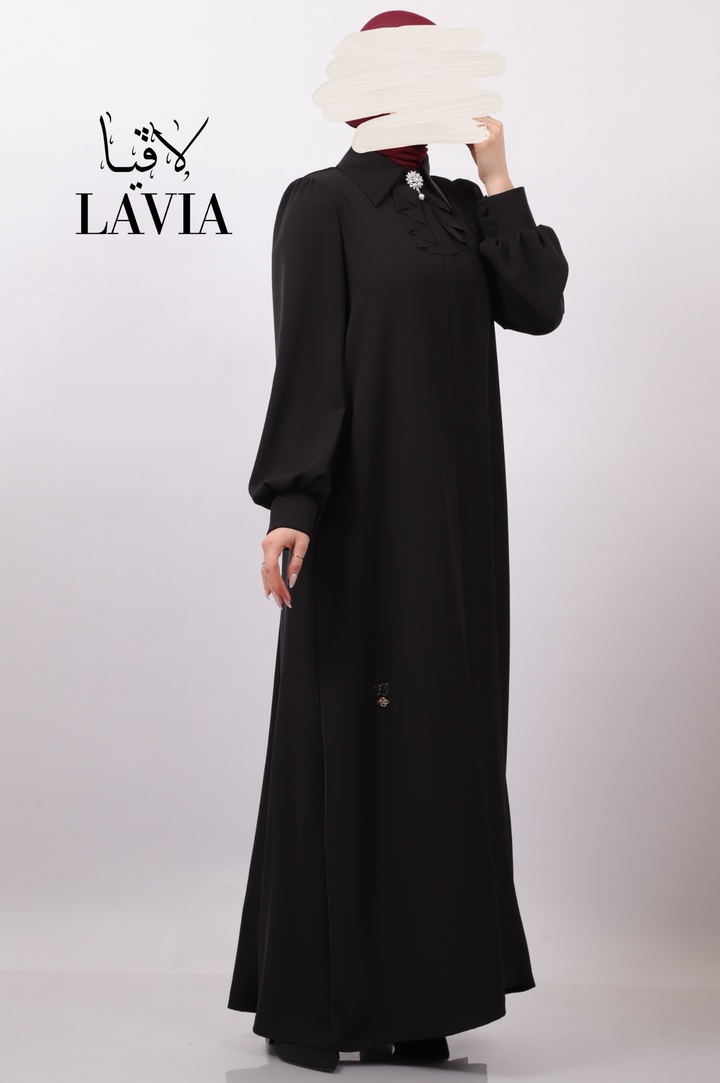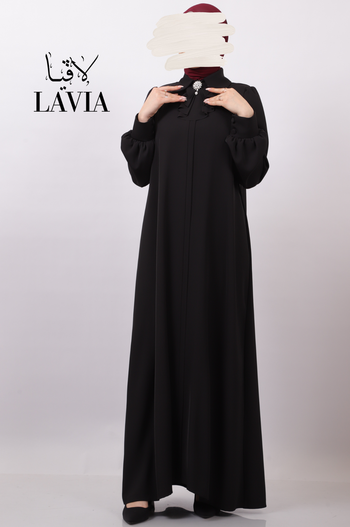 الياقة مزينة بربطة أنيقة 🎀 مع بروش فاخر 🌸 بتمنح لمسة ملكية مميزة، والأكمام الواسعة مع الكشكشة عند المعصم بتضيف نعومة وانسيابية 👗.